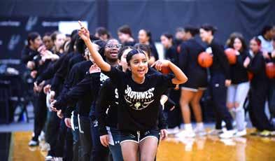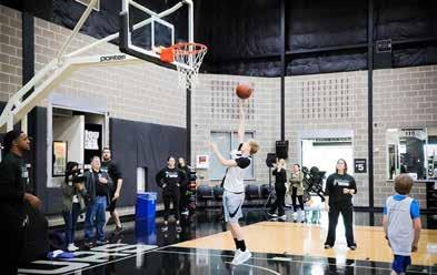 En las fotos aparecen los ejecutivos Peter J. Holt y RC Buford, participantes en clínica de baloncesto y niña practicando baloncesto.