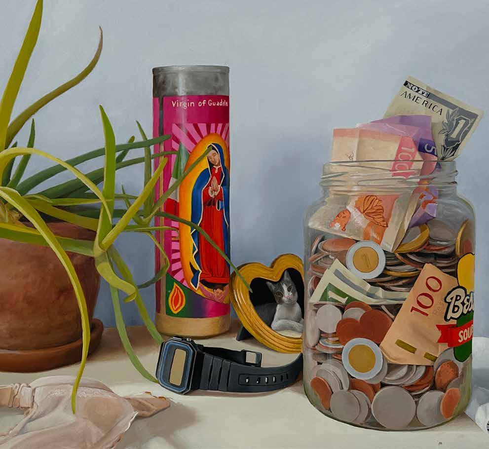 Eva Marengo Sanchez has been featured in stories by Texas Public Radio and Texas Monthly. On her website, she explains that her paintings are carefully crafted with attention to detail, scale, and composition. “Each painting,” she adds, “represents themes in my