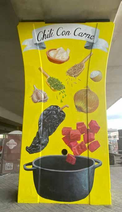 Sánchez’s murals of pan dulce at the San Antonio International Airport and a mural depicting images of chile con carne on a