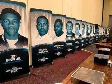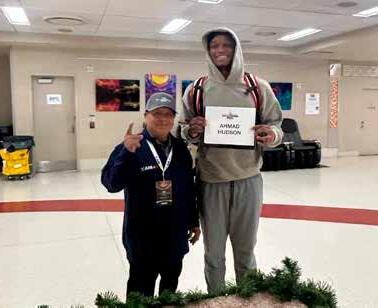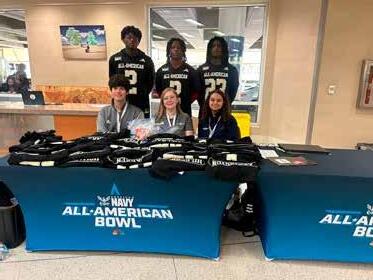 Navy All-American Bowl moments in San Antonio: Navy All-American Bowl Ambassador Robert Romo welcomes elite athletes as volunteers help coordinate arrivals at the Grand Hyatt, including volunteer Mary preparing to check in players. Among those arriving for practices is 2027 five-star tight end Ahmad Hudson, stepping onto the national stage alongside Ambassador Robert Romo.