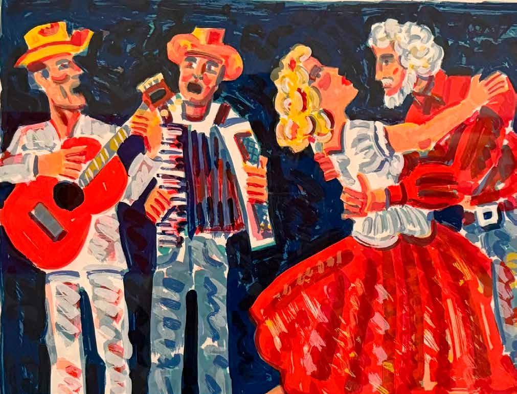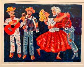 Los Angeles artist Frank Romero’s “Bailando” [Dancing], a watercolor on paper, is also currently featured in the McNay Print Gallery. The work portrays a joyful couple dancing to the music of two Mexican musicians, one with a red guitar and his companion with an accordion.