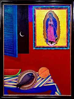 Gonzalez’s colorful piece at the McNay includes a framed portrait of the Virgin of Guadalupe overlooking a tabletop still life of watermelon, fish, and papaya.