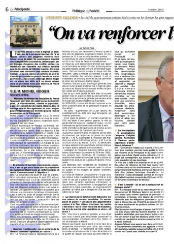 ceux qui souhaitent investir en Principauté. En ce sens, jjʼai ʼai sou sou-haité qu quʼun quʼ un groupe de travail, sous llʼégide ʼégide de Monsieur André GARINO, formule recommanda des recommandations pragmatiques llʼlʼat ʼʼat atatpour « renforcer lʼattractivité de Monaco et augmenter sa capacité à dégager des recettes ».Le » Gouvernement annoncera prochaiprochai nement des mesures concrètes sur les axes suivants : main maintenir une économie diversifiée, mieux accueillir les entreentre preneurs résidents, moderniser notre droit économique, développer le onshore et attirer une nouvelle clientèle pour notre place financière”. ■ Sur les chantiers - le pragmatisme llʼemporte, ʼemporte, llʼhôpital ʼhôpital comme Fontvieille 2. Peut-on parler dʼambid ambi cependant dʼambitions à la baisse ? justeMR : “Concernant llʼhôpital ʼhôpital tout d dʼabord, ʼabord, ccʼest ʼest juste ment pour maintenir une très haute qualité de soins monéaux résidents de la Principauté et du bassin moné gasque que le futur hôpital va être redimensionné : le projet doit correspondre aux besoins de santé de notre population et pas davantage. Ce n nʼest ʼest pas la taille dʼun dʼun projet qui en fait sa qualité. Des pôles de référence de très haut niveau sont confirmés dans ce futur établissement. Les ratios de personnels seront maintenus et le nouvel hôpital sera doté d dʼun ʼun un plateau technique dʼexcellence. dʼexcellence. La recherche y sera développée comme en témoigne déjà llʼeffort ʼeffort important consenti dès 2011 pour renforrenfor cer le Centre Scientifique de Monaco”. ■ Cʼest Cʼest est la rentrée - où en est la restauration du dialogue social ? MR : “Le dialogue social est au cœur des priorités du Gouvernement M. Stéphane Valeri et son équipe ssʼy sont attelés avec comme approche de privilégier la concertation et llʼécoute. ʼécoute. Une dizaine de rencontres bilatérales avec les délégations patronales et syndi syndicales a déjà eu lieu, qui ont permis au Gouvernement de mieux appréhender les positions précises des par partenaires sociaux. Il faut poursuivre les échanges et passer maintenant à une autre phase, celle des réunions tripartites sur des questions sectorielles, pour que chacun puisse expri exprimer son opinion et que des décisions soient prises. La première de ces réunions aura lieu courant octobre sur le travail dissimulé. Je peux d dʼailleurs ʼailleurs vous assurer que, dans ce contexte, le Gouvernement conservera une approche ouverte, afin que la ligne adoptée puisse permettre à tous de se tourner vers llʼavenir ʼavenir avec sérénité et modernité”.