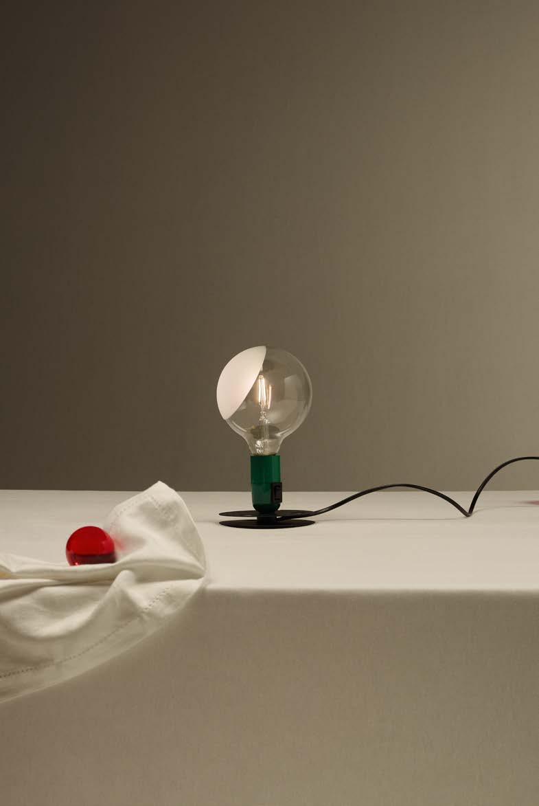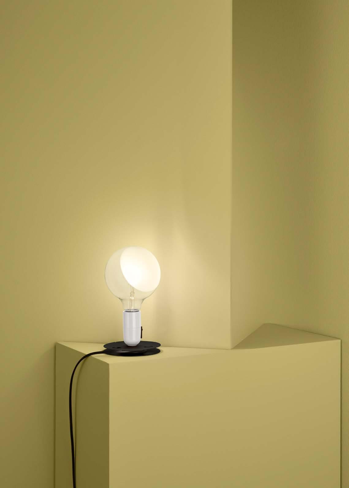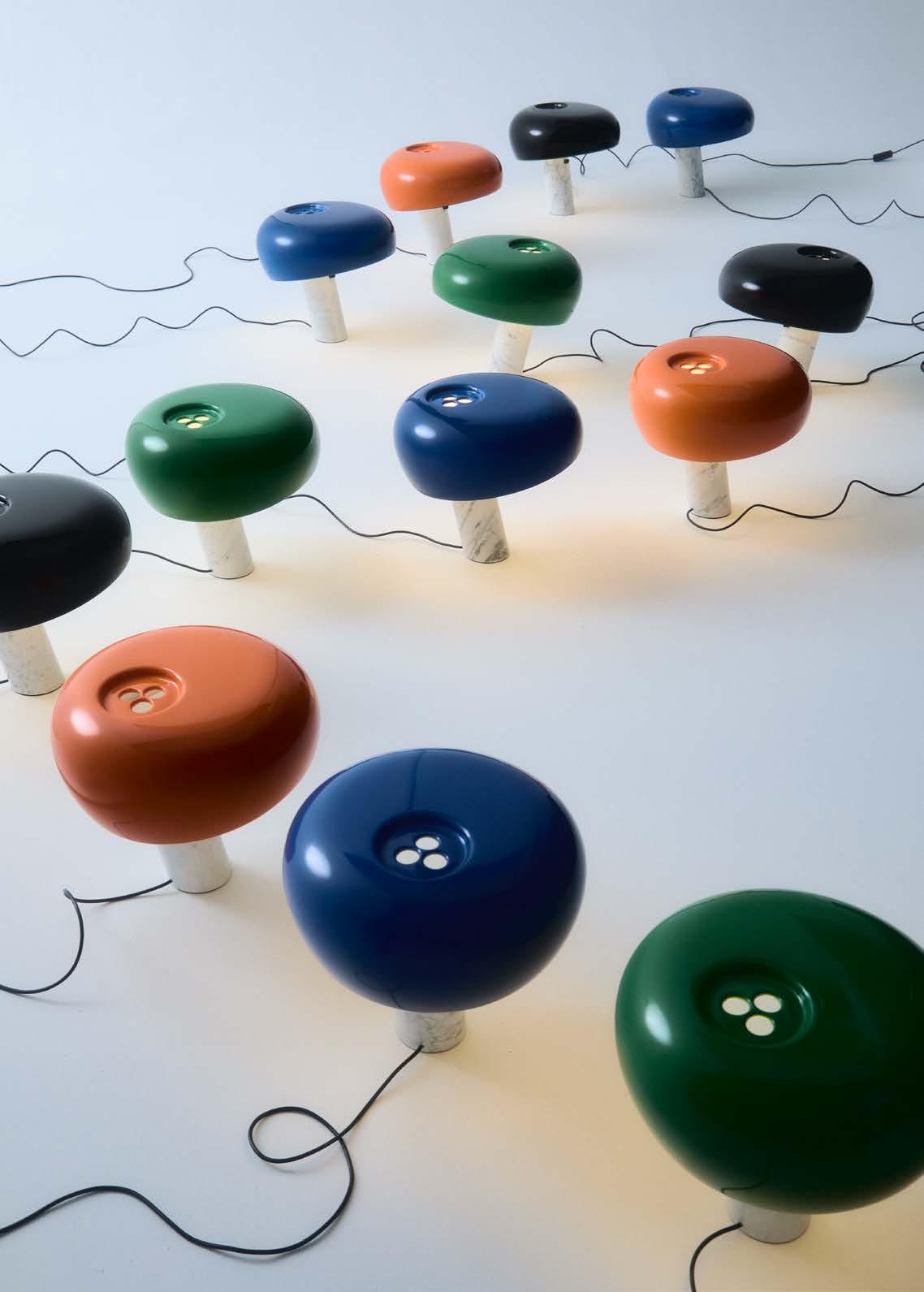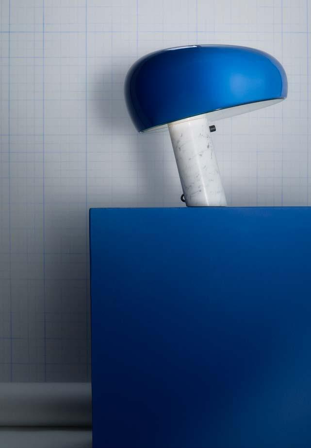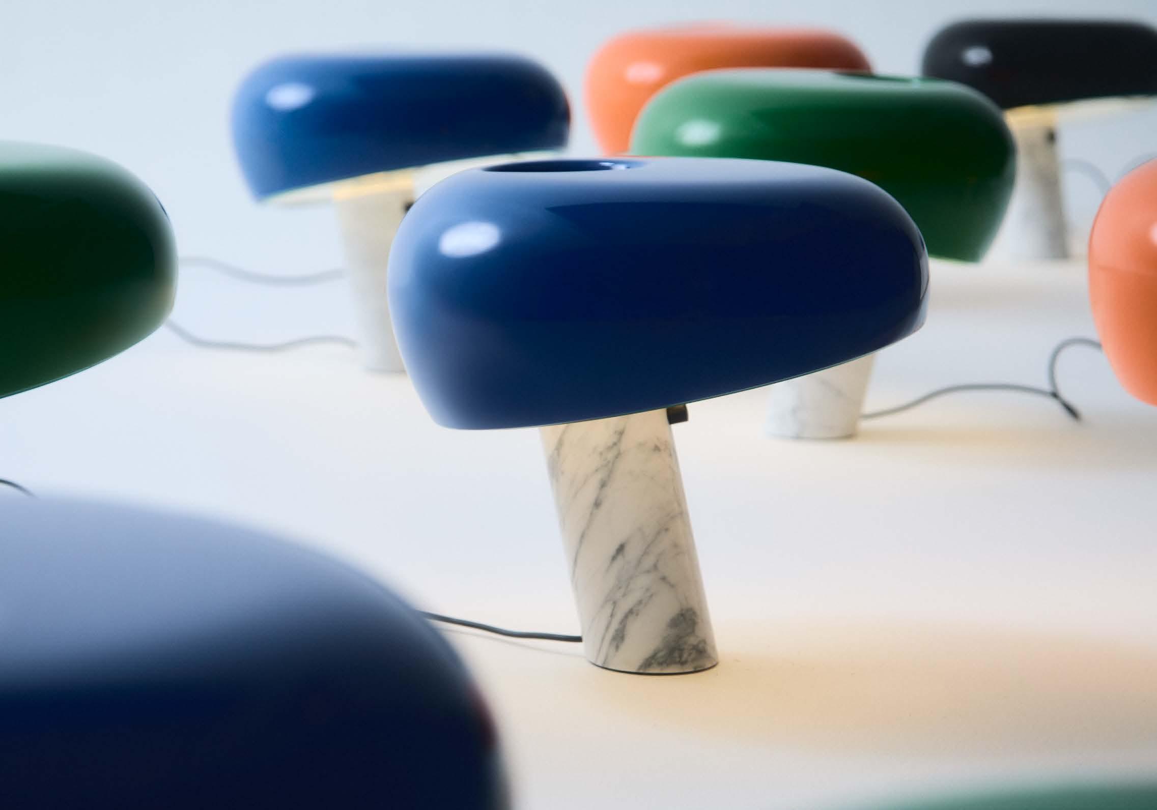 The Snoopy original with the black shade grew into a collection featuring green and orange versions. The latest addition, with a navyblue shade, was inspired by a hue used by Achille and Pier Giacomo on their Sciuko lamp for Flos in 1966.
