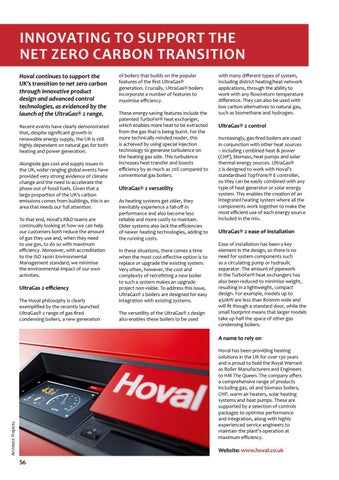 INNOVATING TO SUPPORT THE NET ZERO CARBON TRANSITION Hoval continues to support the UK’s transition to net zero carbon through innovative product design and advanced control technologies, as evidenced by the launch of the UltraGas® 2 range. Recent events have clearly demonstrated that, despite significant growth in renewable energy supply, the UK is still highly dependent on natural gas for both heating and power generation. Alongside gas cost and supply issues in the UK, wider ranging global events have provided very strong evidence of climate change and the need to accelerate the phase out of fossil fuels. Given that a large proportion of the UK’s carbon emissions comes from buildings, this is an area that needs our full attention. To that end, Hoval’s R&D teams are continually looking at how we can help our customers both reduce the amount of gas they use and, when they need to use gas, to do so with maximum efficiency. Moreover, with accreditation to the ISO 14001 Environmental Management standard, we minimise the environmental impact of our own activities.