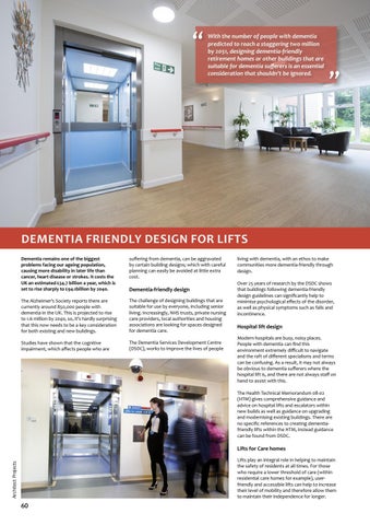 DEMENTIA FRIENDLY DESIGN FOR LIFTS Dementia remains one of the biggest problems facing our ageing population, causing more disability in later life than cancer, heart disease or strokes. It costs the UK an estimated £34.7 billion a year, which is set to rise sharply to £94.1billion by 2040.