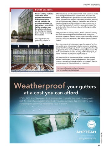 different colours, as well as a Green Wall Trellis System to create outstanding aesthetics on the exterior of the structure. The panels are arranged with lighter colours at the top so that the façade lightens as the height of the building increases, reducing the perceived mass and volume of the building and softening it against its backdrop. Planter boxes are also incorporated at the top of the façade to fit in with the green aesthetics of the project, another factor that contributed to it being named Car Park of the Year. With years of invaluable experience, Berry’s extensive industry and product knowledge enables them to work closely with architects right from the early design stage and manage projects from conception to completion – and not just for cladding and facades. Berry has grown in recent years to expand its scope of services into a wide range of industries, including perimeter security as part of the HS Security group. Berry’s knowledge of such a wide range of industries means architects and specifiers can benefit from end-to-end solutions for cladding and façade projects, as well as perimeter security and car park projects. The Watts House car park was the perfect example of Berry Systems’ cladding and façade design expertise and showed how they use their extensive knowledge of the supply chain to provide support all the way through to installation.