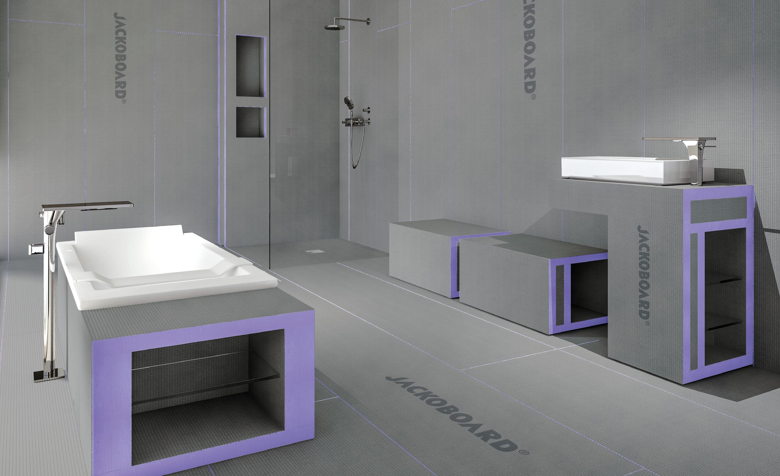 Made from an extruded polystyrene foam, JACKOBOARD® construction boards are waterproof, easy to work with and cut, and truly lightweight. Finished on both sides with a special coating and reinforcing fibreglass mesh, they are ready to be tiled, rendered or plastered. Their excellent thermal insulation properties give them enormous advantages over plasterboard or cement board. The construction boards are perfectly suited for interior construction and furnishings – especially in rooms subject to high moisture levels.
