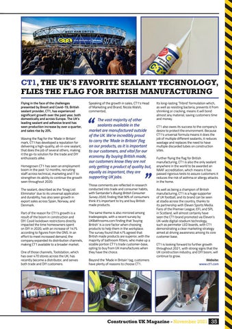 CT1, THE UK’S FAVORITE SEALANT TECHNOLOGY, FLIES THE FLAG FOR BRITISH MANUFACTURING Flying in the face of the challenges presented by Brexit and Covid-19, British sealant provider, CT1, has experienced significant growth over the past year, both domestically and across Europe. The UK’s leading sealant and adhesive brand has seen production increase by over a quarter, and sales rise by 20%. Waving the flag for the ‘Made in Britain’ mark, CT1 has developed a reputation for delivering a high-quality, all-in-one sealant, that does the job of several others, making it the go-to solution for the trade and DIY enthusiasts alike. Homegrown CT1 has seen an employment boom in the past 12 months, recruiting staff across technical, marketing and IT to strengthen its ability to continue the growth seen throughout 2020. The sealant, described as the ‘Snag List Eliminator’ due to its universal application and durability, has also seen growth in export sales across Spain, Norway, and Denmark. Part of the reason for CT1’s growth is a result of the boom in construction and DIY. Covid lockdown restrictions directly impacted the time homeowners spent on DIY in 2020, with an increase of 147% according to figures from the ONS. In an effort to meet increased demand, the company expanded its distribution channels, making CT1 available to a broader market. One of those channels, Toolstation, which has over 470 stores across the UK, has recently become a distributor, and serves both trade and DIY customers.