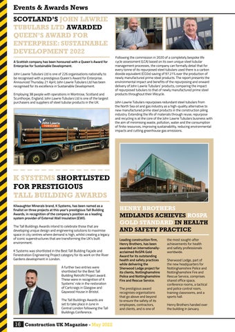 Events & Awards News SCOTLAND’S JOHN LAWRIE TUBULARS LTD AWARDED QUEEN’S AWARD FOR ENTERPRISE: SUSTAINABLE DEVELOPMENT 2022 A Scottish company has been honoured with a Queen’s Award for Enterprise for Sustainable Development. John Lawrie Tubulars Ltd is one of 226 organisations nationally to be recognised with a prestigious Queen’s Award for Enterprise. Announced Thursday 21 April, John Lawrie Tubulars Ltd has been recognised for its excellence in Sustainable Development. Employing 38 people with operations in Montrose, Scotland and Scunthorpe, England, John Lawrie Tubulars Ltd is one of the largest purchasers and suppliers of steel tubular products in the UK.