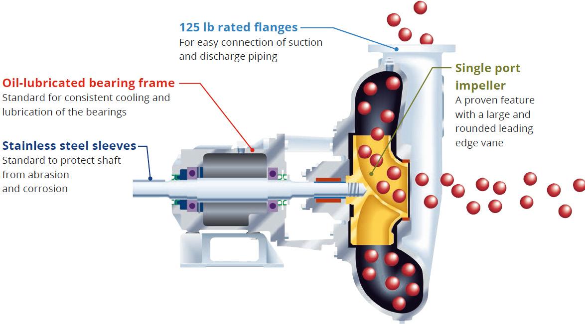 After this assessment, a 10” hydrotransport food pump with a single port impeller and expanded offset volute was chosen for the job. This size pump was needed to handle the system’s flow and pressure reqiurements and to ensure that the largest onions would not plug the pump.