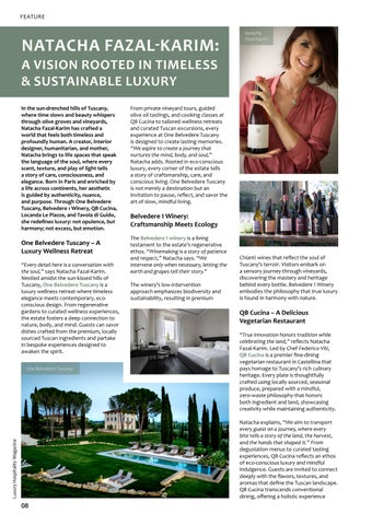 “Every detail here is a conversation with the soul,” says Natacha Fazal-Karim. Nestled amidst the sun-kissed hills of Tuscany, One Belvedere Tuscany is a luxury wellness retreat where timeless elegance meets contemporary, ecoconscious design. From regenerative gardens to curated wellness experiences, the estate fosters a deep connection to nature, body, and mind. Guests can savor dishes crafted from the premium, locally sourced Tuscan ingredients and partake in bespoke experiences designed to awaken the spirit.