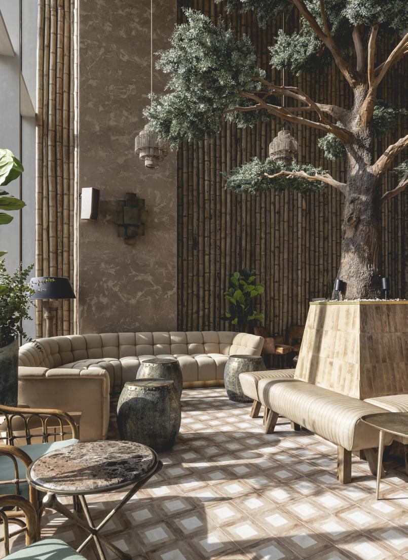 contemporary, yet culturally ambiguousand therefore easily adaptable long into the future. The towering 5 metre Bonsai tree and bamboo-clad back wall of the front lounge area offer the only direct material nods to the restaurant’s current cuisine.