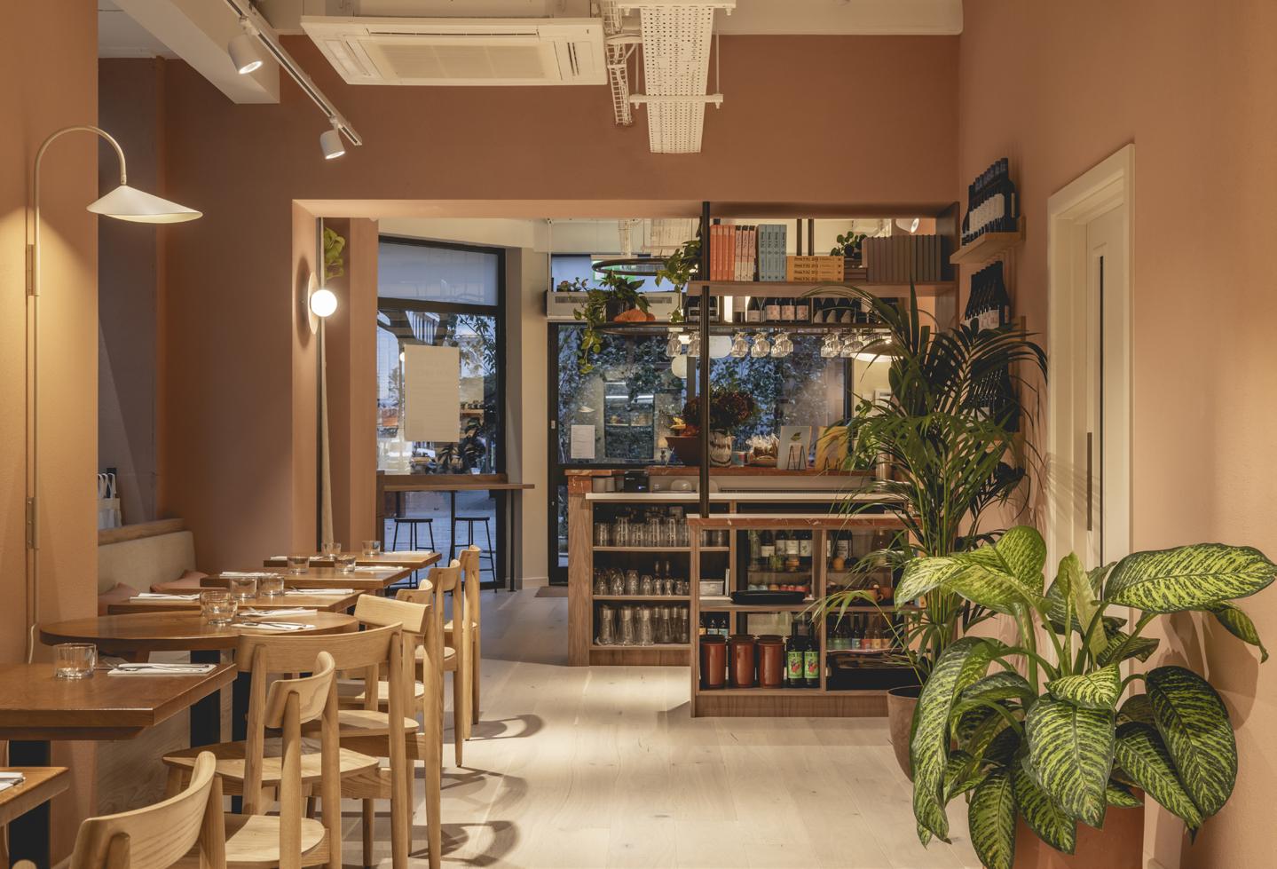 From the outside the shopfront has retained its existing palettes of red granite and dark grey glazing frames while Studio Found selected a pale pink tone for the fascia to tie the exterior and interior colours together.