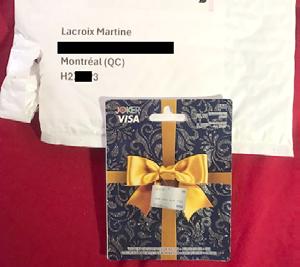 Les boîtes aux lettres n’ont souvent plus rien à nous offrir, si ce n’est quelques promos qui se retrouvent ipso facto dans le bac bleu. Comment alors ne pas être excitée comme une puce en constatant que le personnel de Postes Canada m’avait livré une mystérieuse enveloppe à bulles. Après l’avoir ouverte, ne voilà-t-il pas qu’apparaît une carte prépayée Visa d’une valeur de 50 $. En ce qui me concerne, c’était plutôt un visa pour le pays du gros malaise…