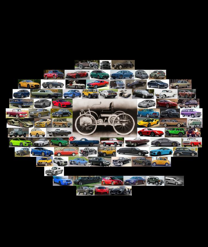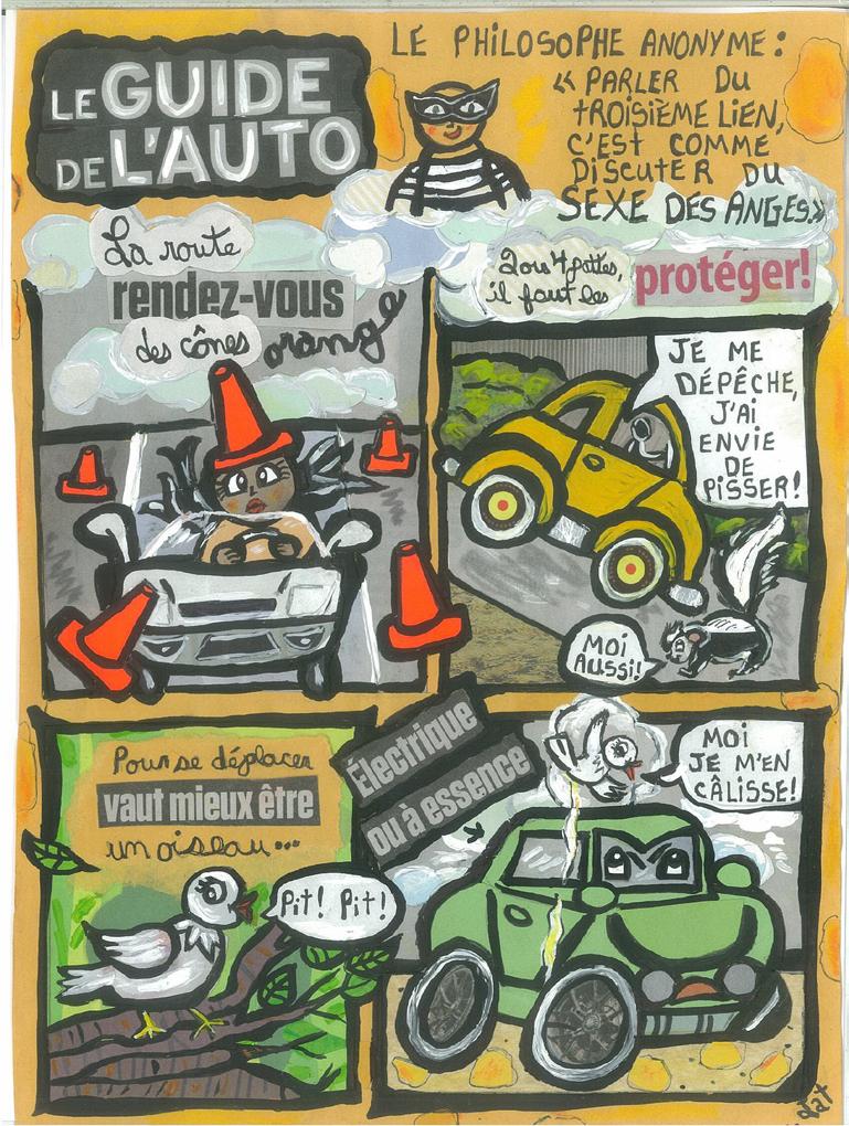 « Ce visuel pour la couverture n’est pas tout à fait ce que je prévoyais faire au début, mais, comme tout processus de création, au fur et à mesure que l’on progresse, cela change sans cesse. Par exemple, l’assemblage de voitures illustrait au départ la lettre “Q” du magazine de rue La Quête. En insérant au centre de l’assemblage l’image de la première automobile conçue par Henry Ford, le “Q” s’est transformé en émoji avec une paire d’yeux. La trame en arrière-fond représente un moteur qui est le cœur de l’automobile. Les clés en contraste nous rappellent la joie d’une nouvelle acquisition. Et non, je n’ai pas oublié la Volkswagen New Beetle. Chercher la coquine coccinelle !!! »