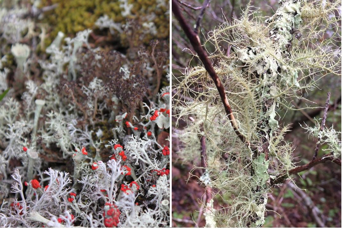 Sur la figure de gauche se trouvent environ cinq espèces différentes de Cladonia spp. Des espèces communes se trouvant directement sur les sols exposés au soleil. Les petites « trompette » et les amas rouges sont des apothécies l’organe de reproduction d’où sortirons les spores servant à la reproduction. En temps sec ou ensoleillé, certains randonneurs auront tôt fait de remarquer le bruit croustillant que fait leur pas en marchant sur les Cladonies. Ceux-ci se brisent effectivement en petits fragments qui, ne vous en inquiétez pas, peuvent servir à la dispersion de ces espèces. C’est la reproduction par fragmentation. Il faut toutefois rester sur le sentier en tout temps ou préférablement éviter le piétinement répété puisqu’à long terme cela peut mener à l’extirpement des colonies. Sur l’image de droite, on peut voir principalement une Usnea spp. et des lichens foliacés. Les Usnea, une source de nourriture importante pour les Caribous, peuvent également être consommés par les humains sous forme de décoction principalement pour ces bienfaits médicinaux.