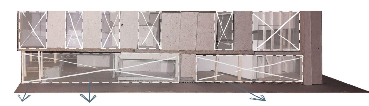 Proposed design: The new ALB design mostly opens up to the northern side, breaking through the façade to allow entry to the green roof, theater, and business courtyard. The facade has been adapted to permeate through as much as possible of the towering facade, to allow the public into the previously without losing its character (Fig 111&112).