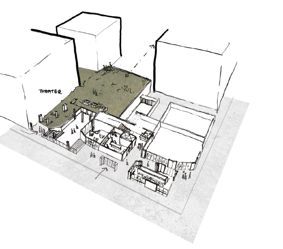 Horizontally the circulation in this building spills from the center outwards into separate functions/ allocated uses. The vertical circulation is centralized but is also used as a focal point as it spirals up, visible from the theater entrance and the roof garden above. It is a visual anchor point in the shared courtyard in between the ALB, the Coffee brewery, and the Traditional medicine center (Fig126).