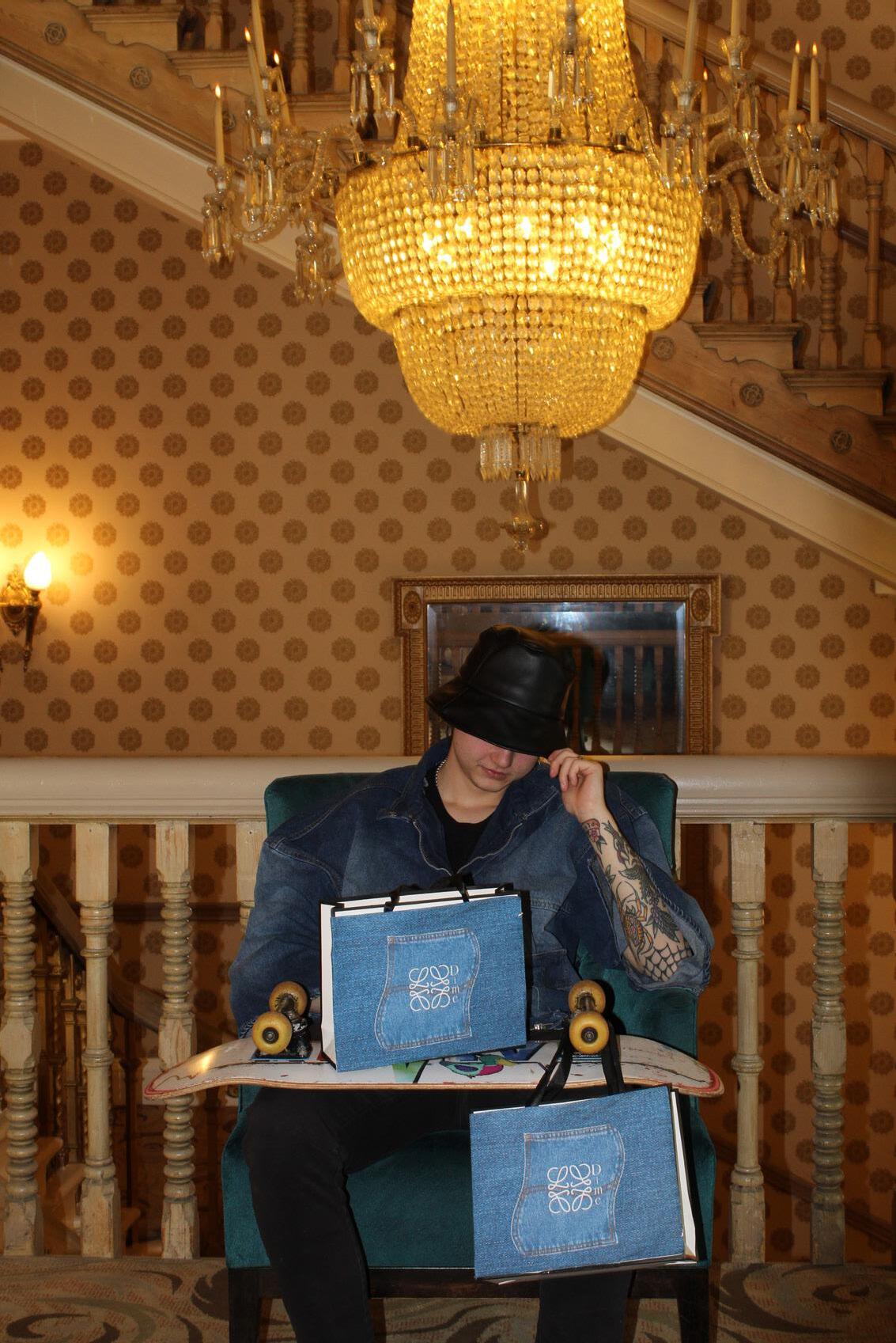 On the 19th March i did some testing of poses and initial ideas I had such as using a skateboard as a tray and trialing poses, in which my friend modelled for me as he will be doing the final shoot with me. I also practised using my camera and using different settings and lighting. I realle like the idea of using the board as a tray as it stands out because its not the usual way to use a board. Typically skaters roll cigarettes on their board like this so the idea was to play with that but fancier such as using a glass of wine and a vase etc. He is also wearing the jacket from our initial designs. We will be using this idea at the final shoot location of the Grosvenor hotel so that it stands out.