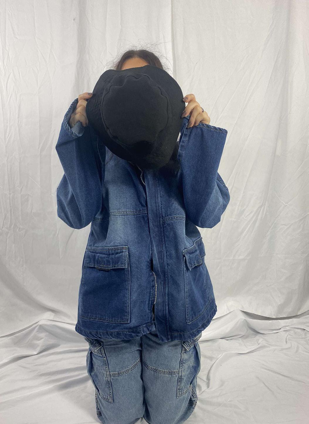 These are the first pictures we took to gain inspiration for poses and how to style the jacket. We had to improvise using example products such as this bucket hat to use as an example of what it will look like.
