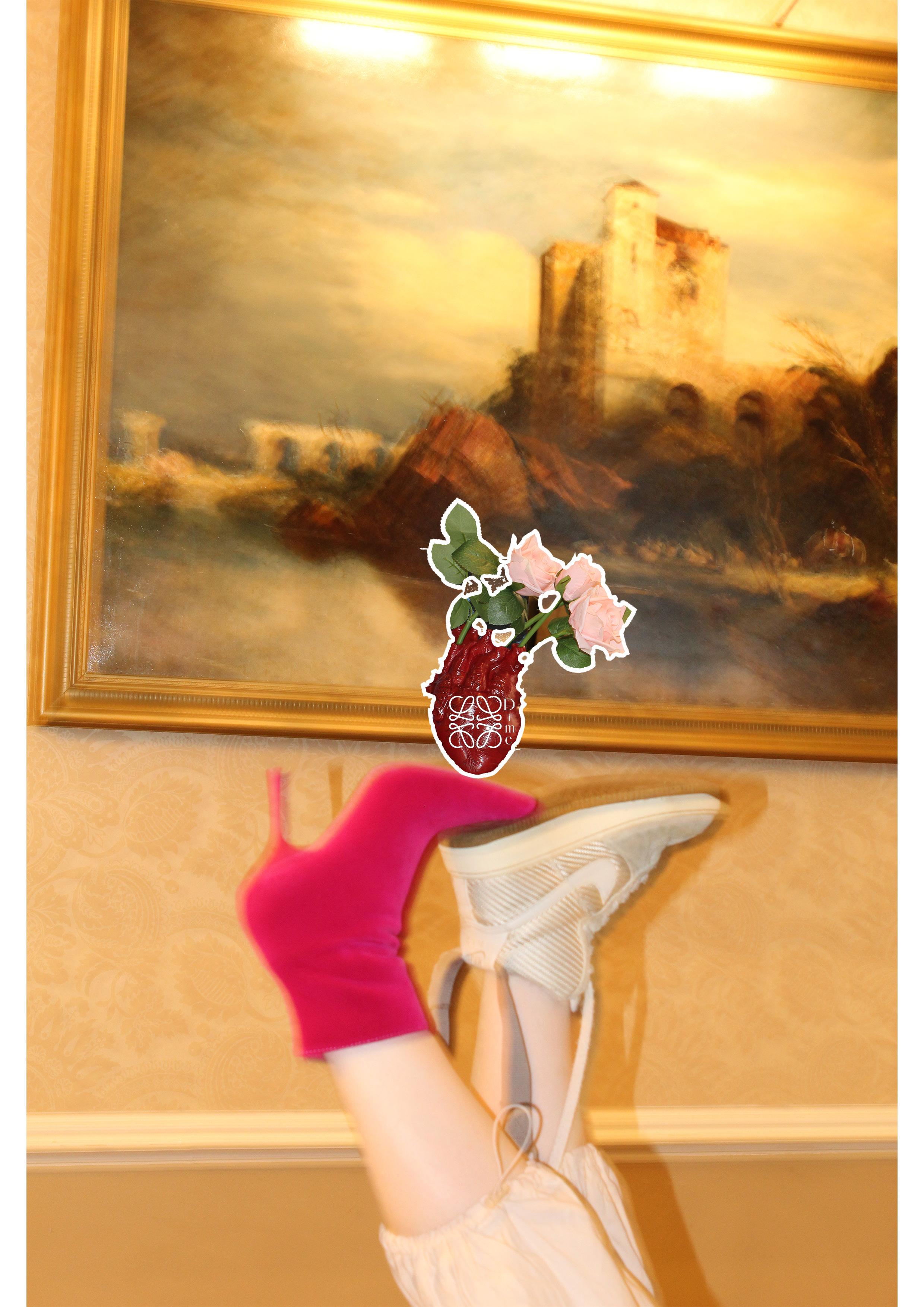 Going back to page 9 where I showed my moodboard of ideas for product photography and how I could shoot the homware, Here we have executed the idea of having a trainer and a heel to contrast luxury and street style. On the right is a Photoshop edit made by me where the heart vase is on the heel, I created it in a sticker like way to link to street style, and because skaters use stickers to decorate their boards.