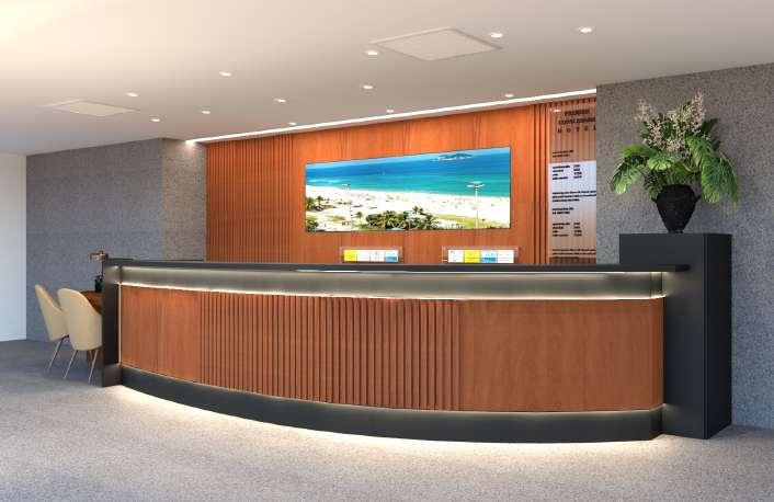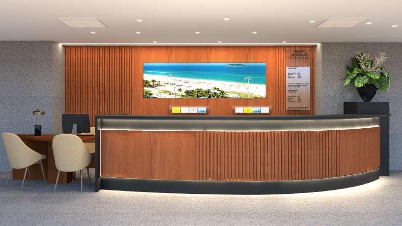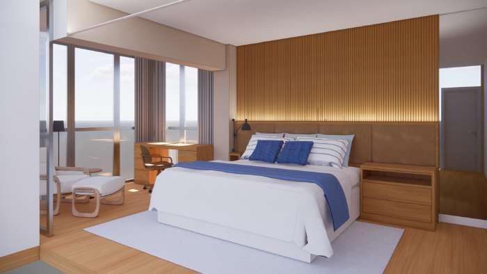 Incorporamos nuances de azul, evocando a serenidade do mar, enquanto a madeira foi escolhida para proporcionar calor e conforto O brilho sutil, por sua vez, complementa a composição arquitetônica, conferindo-lhe um requinte adicional.