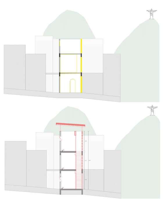 Situada em Botafogo, na comunidade do Tabajaras, esta residência familiar, integrada a uma pequena vila, se destaca por seus três pavimentos, cada um abrangendo aproximadamente 13m². A lacuna no planejamento eficiente dos espaços impacta diretamente o conforto e a saúde dos moradores