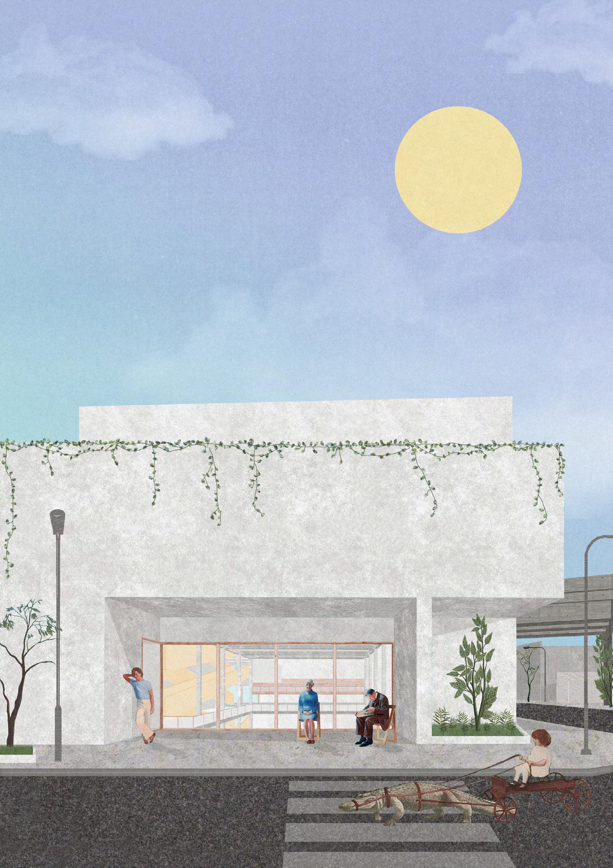 El Centro, ubicado en la calle Iturri, entre Av. Dorrego y Leiva, se consolida con una fachada de hormigón a la vista que responde a su contexto urbano, mimetizandose con el viaducto que atraviesa el terreno por el medio. De esta manera, se generan dos bloques: uno deportivo y otro cultural y social que se conectan por el subsuelo proponiendo una libre circulación desde el nivel 0.0 y generando un recorrido peatonal por debajo del viaducto.
