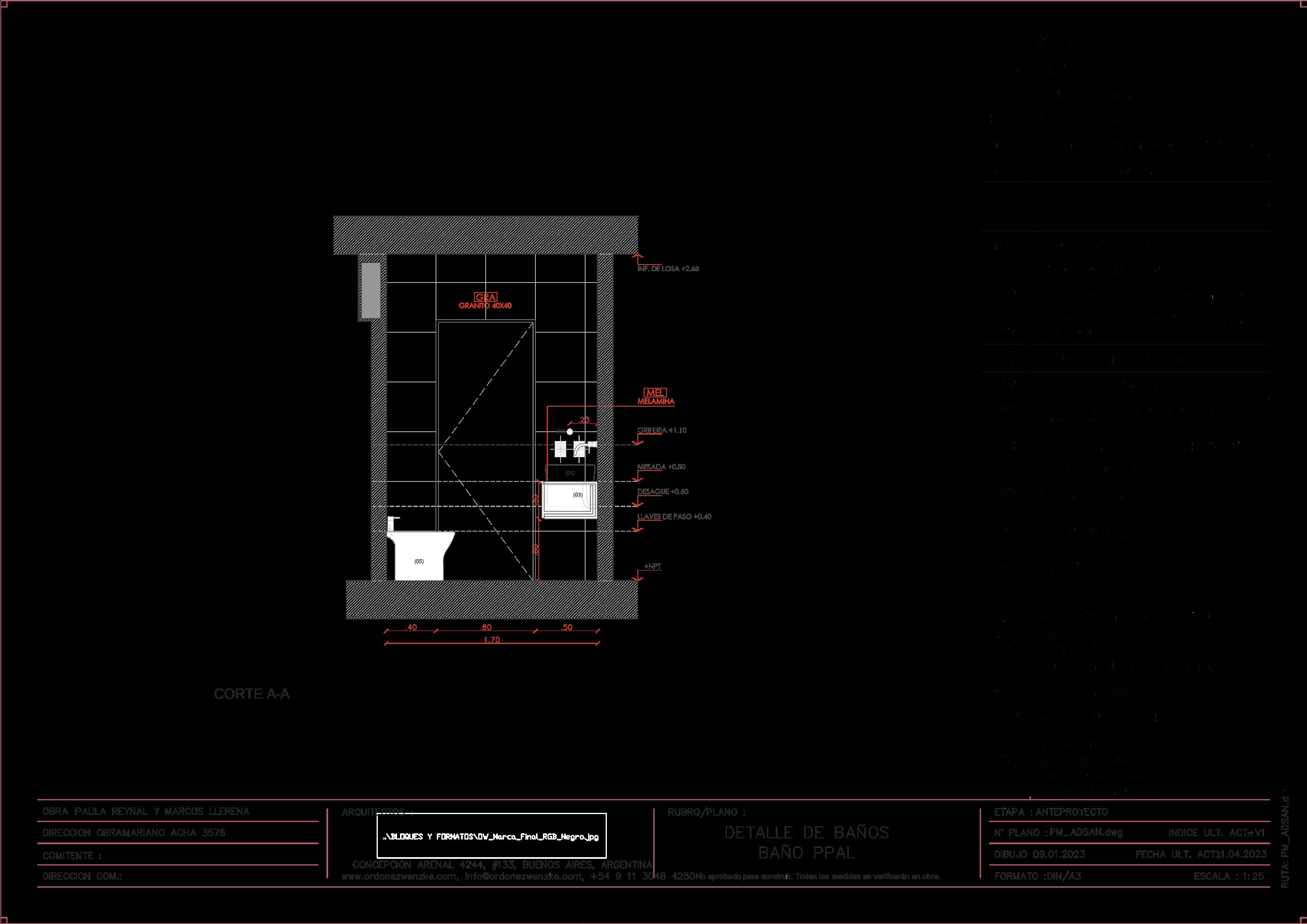 GRA GRANITO 40X40 +NPT -0.05 (100) ESPEJO (01) (02) CAJON INTERNO CAJON (03) CAJON INTERNO CAJON CAJON MESADA +0.80 INF. DE LOSA +2.63 LLAVES DE PASO +0.40 +1.20 GRIFERIA +1.10 DESAGÜE +0.60 1,43 FILO SUP. ESPEJO +2.00 GRA GRANITO 40X40 FILO SUP. VENTANA +2.10 (10) PERCHAS +1.80 LAQ LAQUEADO GRIFERIA +0.90 (07) TRANSFERENCIA +0.60 FLOR DE DUCHA +2.20 INF. DE LOSA +2.63 +NPT FILO SUP. VENTANA +2.10 ANTEPECHO +1.04 (06) MESADA +0.80 MEL MELAMINA 0,85 V-04 0.60