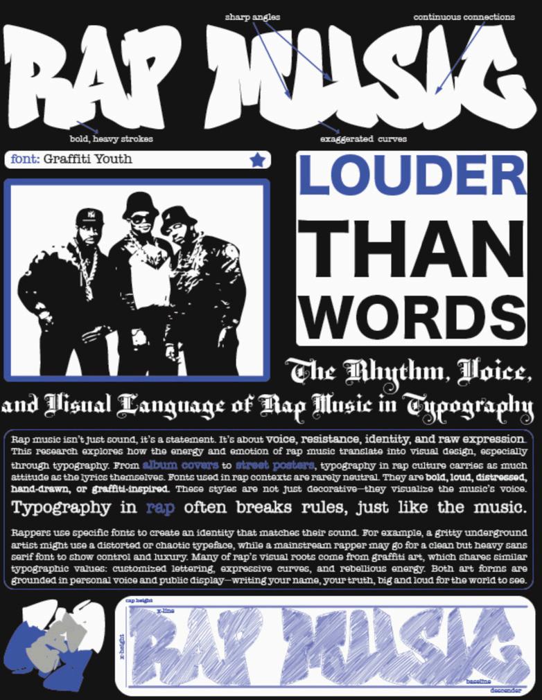Typography Style page design project, I found inspiration in a Rap Music theme, and used Ps and Ai to bring this modern graffiti inspired layout together.