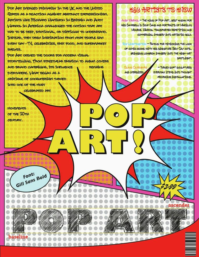 For this Twentieth Century Typography page design project, I found inspiration in a comicbook theme, and used Ps and Ai to bring this pop art inspired layout together.