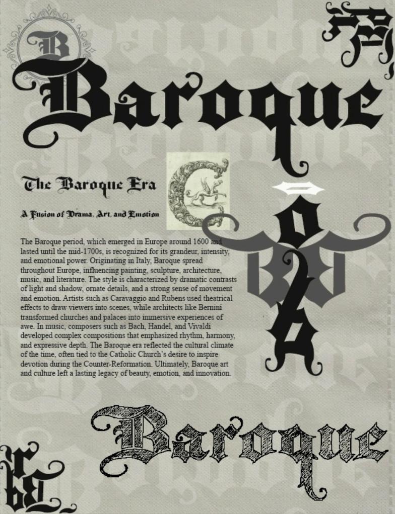 For this Renaissance Typography page design project, I found inspiration in a Baroque theme, and used Ps and Ai to bring this layout that fits the time period’s aesthetic together.
