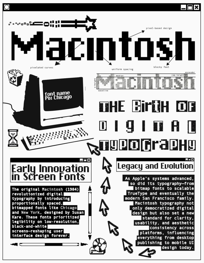 For this Contemporary Typography and Digital Technology page design project, I found inspiration in a Macintosh theme, and used Ps and Ai to bring this black and white pixelated layout together.