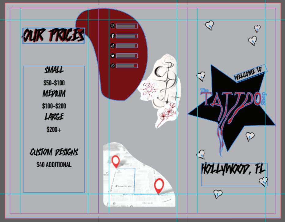FOR THIS ASSIGNMENT I DESIGNED WHAT I WANTED THE TRIFOLD TO LOOK LIKE ON MY SKETCHBOOK, AND USED A COMBINATION OF INDESIGN, ILLUSTRATOR AND PHOTOSHOP TO MAKE IT COME TO LIFE. ALL OF THE TYPOGRAPHY WAS GENERATED IN INDESIGN, WHILE THE ILLUSTRATIONS AND PICTURES HAD TO BE PRE-CREATED IN ILLUSTRATOR OR PHOTOSHOP.