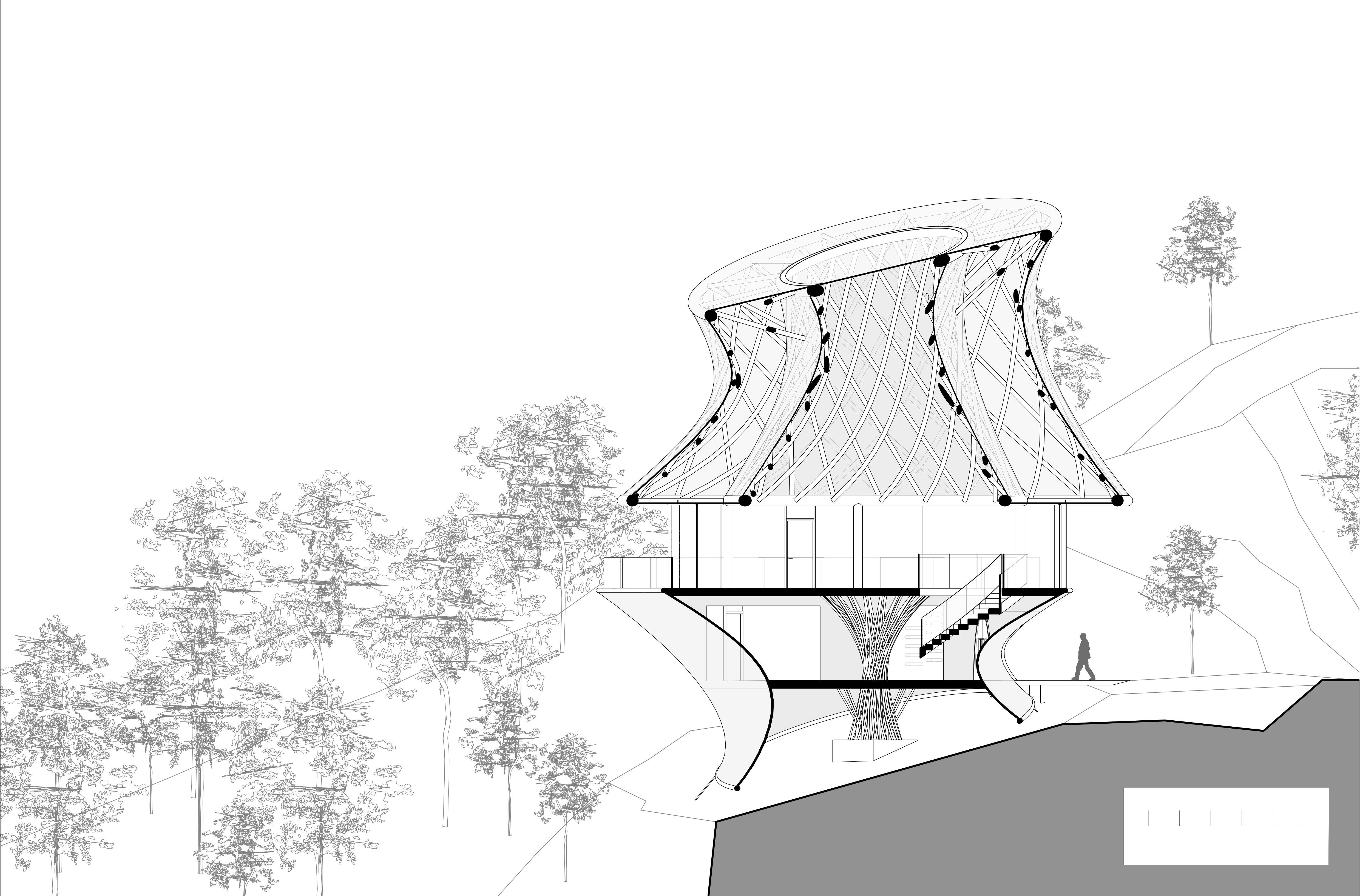 We were asked to test architectural lightness by designing a new exercise room for an idyllic yoga retreat in Portugal. The design was allowed to operate on the line between reality and utopia, and to consciously pose the question if poetic forms can be expressed as lightweight constructions. During this course, the programmes Rhino and Grasshopper were introduced as parametric design was a key element of this module.