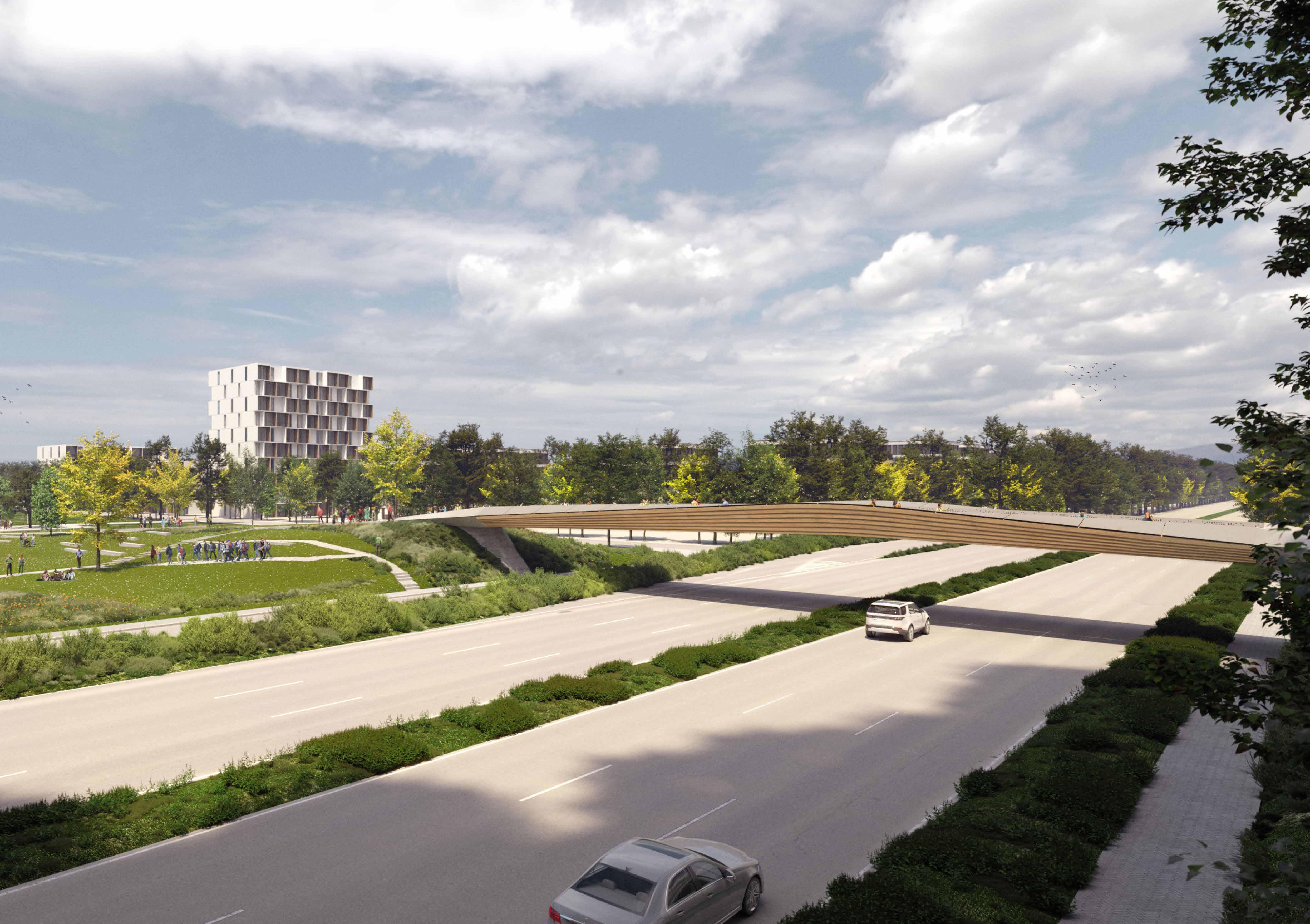 A barrier-free ramp connection as part of the landscape base up to the roof terrace