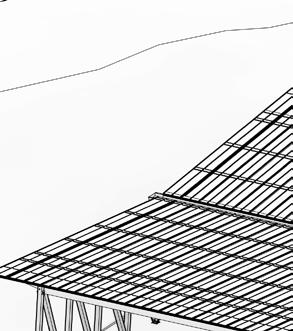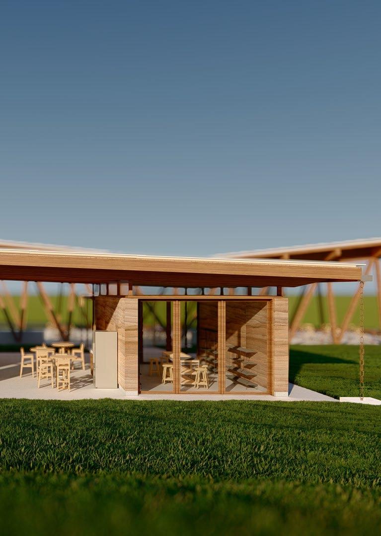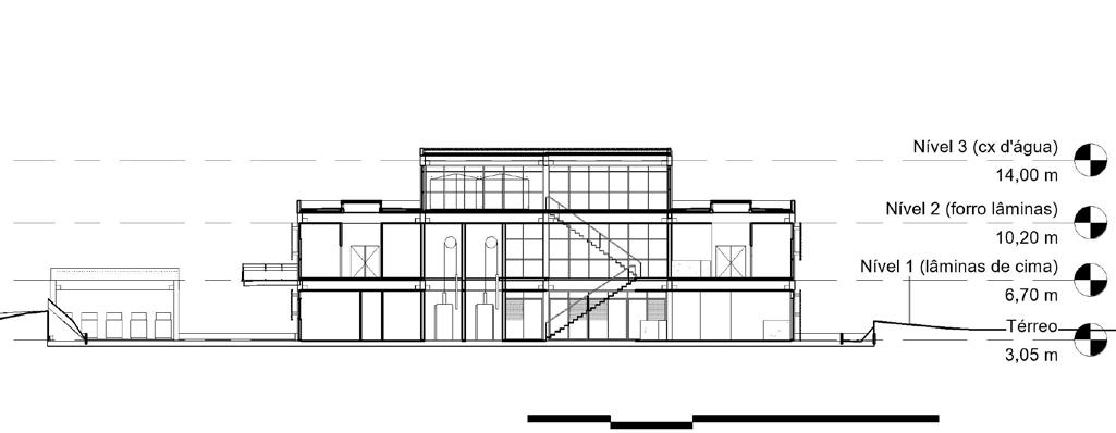 Assim como o Bloco Administrativo, o Galpão da Escola de Construção desde o ínico do desenvolvimento projetual levou em consideração os requisitos mínimos: um vão principal de no mínimo 15m, área máxima de 500m², bancadas de trabalho e pias. Dessa maneira escolhemos trabalhar com MLC - madeira lamelada colada - que consegue suprir as dimensões demandadas pelo grande vão. Sempre considerando as tecnologias e as informações de aula.