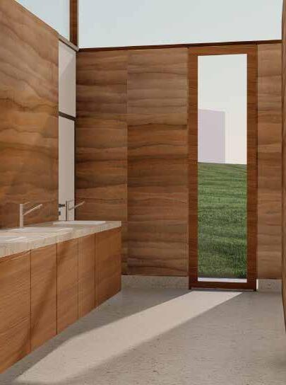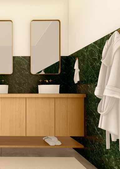 Para os acabamentos, foram utilizados os catálogos da Docol e Portobello Revestimentos. Sendo que, a escolha do revestimento das paredes é o que dá nome ao projeto: a pedra verde que assemelha-se com uma esmeralda foi empregada em pouco mais de meia parede em todo o contorno do banheiro e parede inteira na porção correspondente ao box. Sabe-se que, na psicologia das cores, o verde relaciona-se com saúde, vitalidade e relaxamento, agregando a proposta inicial de fazer desse ambiente um spa.