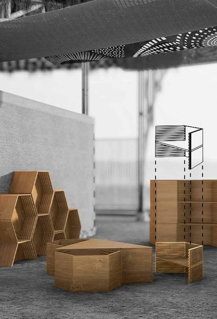 Os móveis, construídos com madeira local, se adaptam à diferentes alturas, permitindo que sejam utilizados por várias idades. E, também, deu design flexível possibilita diferentes combinações