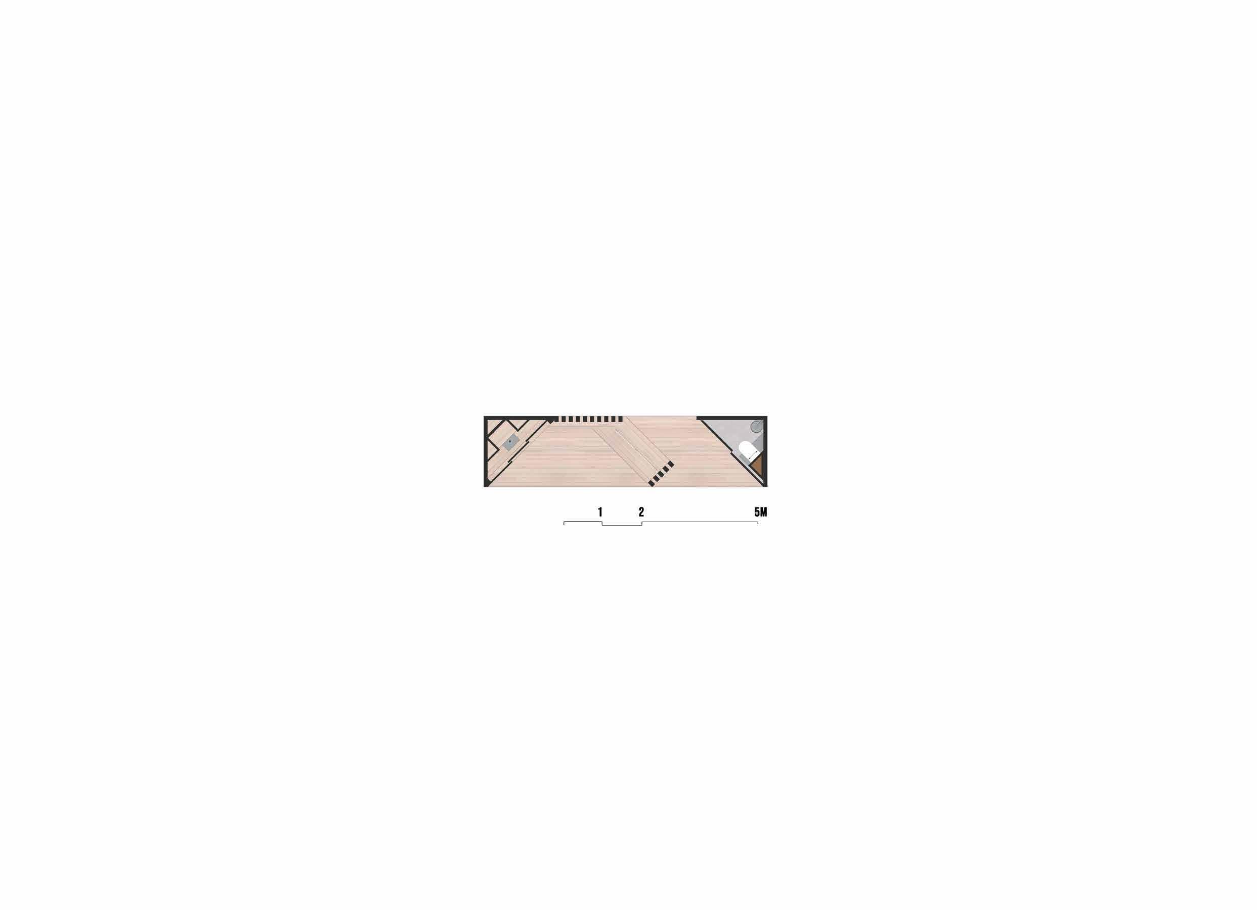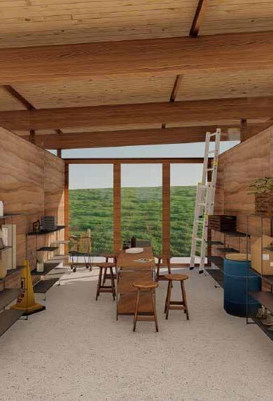 Com isso, o Bloco Administrativo conta com paredes estrutuais de taipa de pilão e a estrutura de cobertura foi solucionada com uso de MLC acompanhada de telhas termoacústicas. A planta, por sua vez, desenvolve-se de forma a priorizar a comunicação do bloco ao galpão de aulas. Grantindo fácil acesso aos ambientes compartilhados - banheiros, copa, almoxarifado - e, ao mesmo tempo, garantir certa privacidade àqueles cômodos de acesso mais restrito.