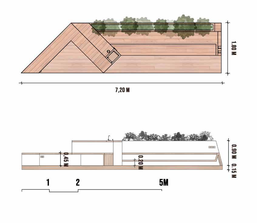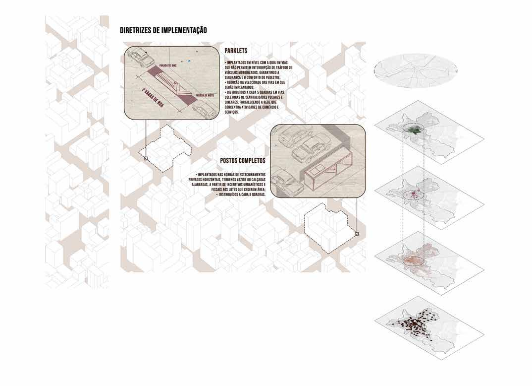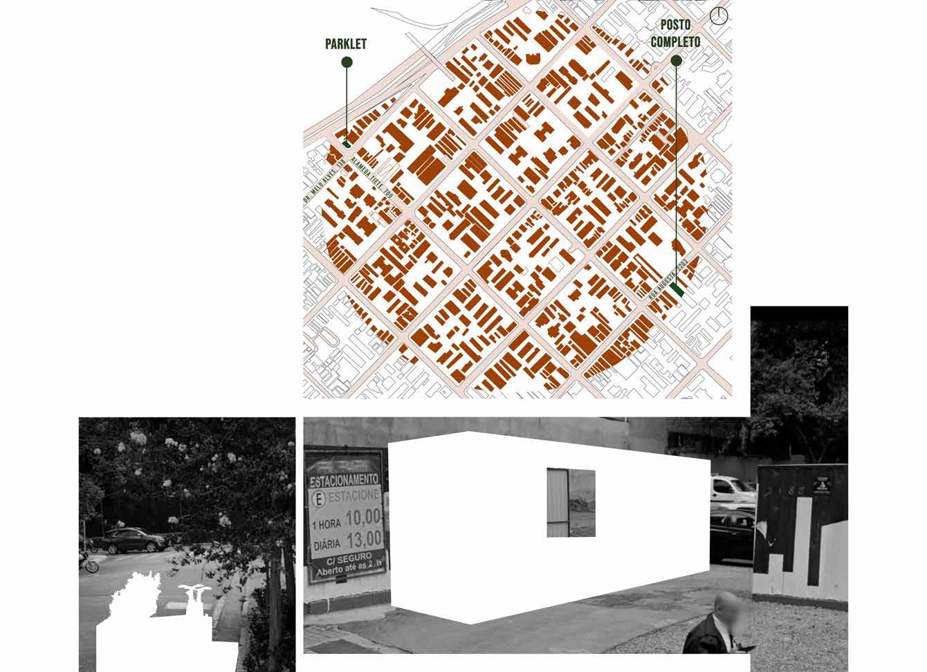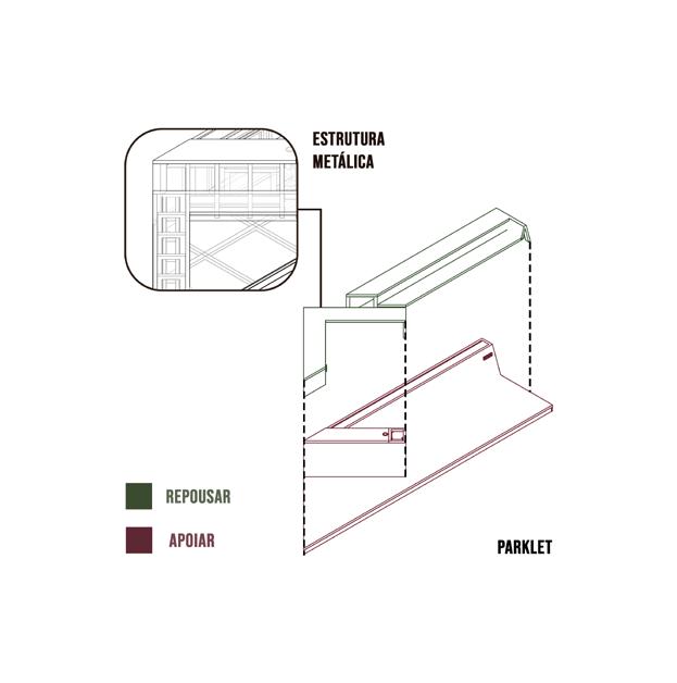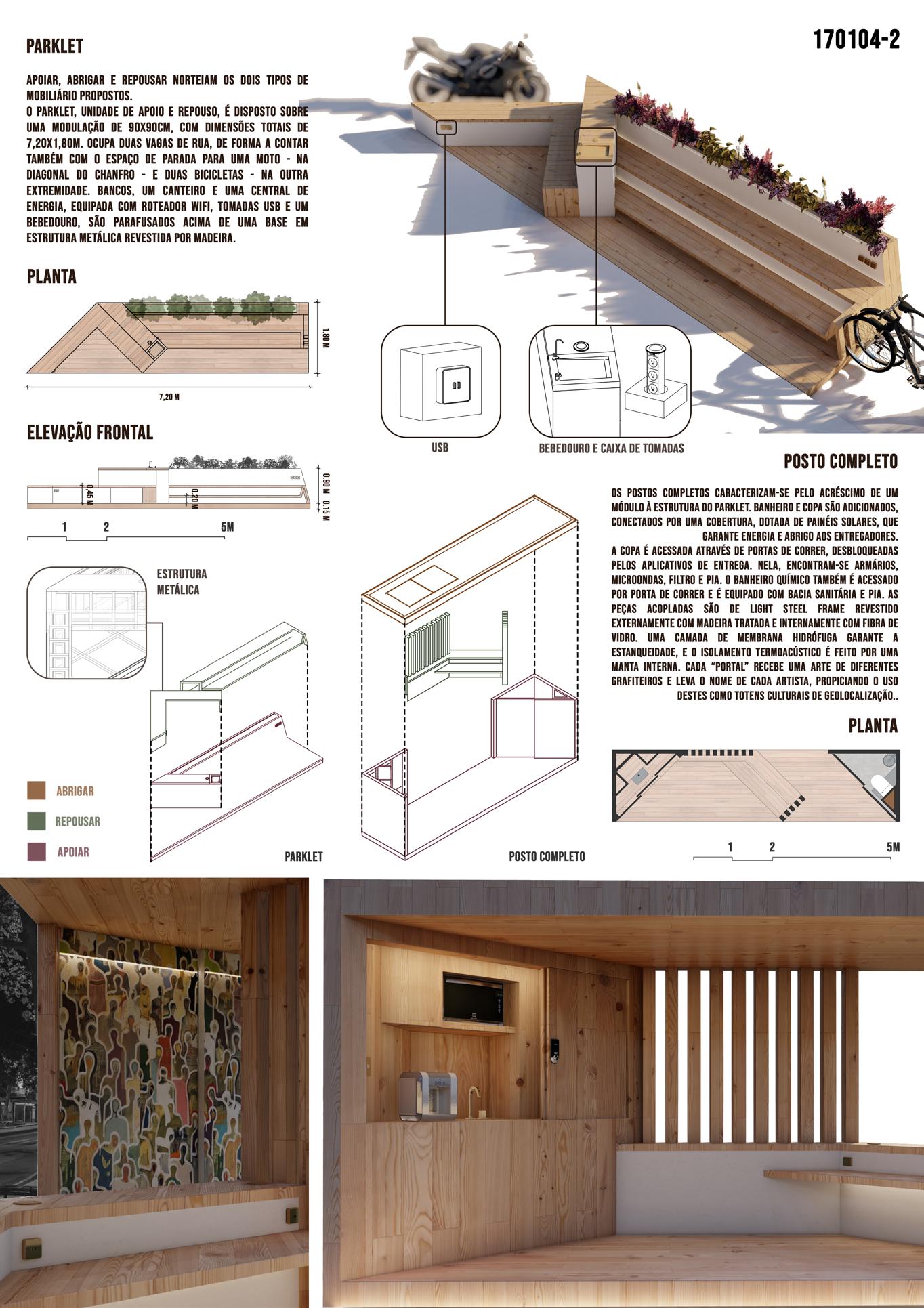 implantados em nível com as guias, evitando interrupção do tráfego nas vias, são equipados com tomadas, bebedouro e lugar de repouso. Já os postos completos, implantados em bordas de estacionamentos, terrenos vazios ou calçadas largas, caracterizam-se pelo acréscimo de um módulo ao parklet, equipando-o também com sanitário e uma copa.E, assim, mesmo que em diferente escalas, atendem às três palavras que sintetizam o partido: abrigar, repousar e apoiar.