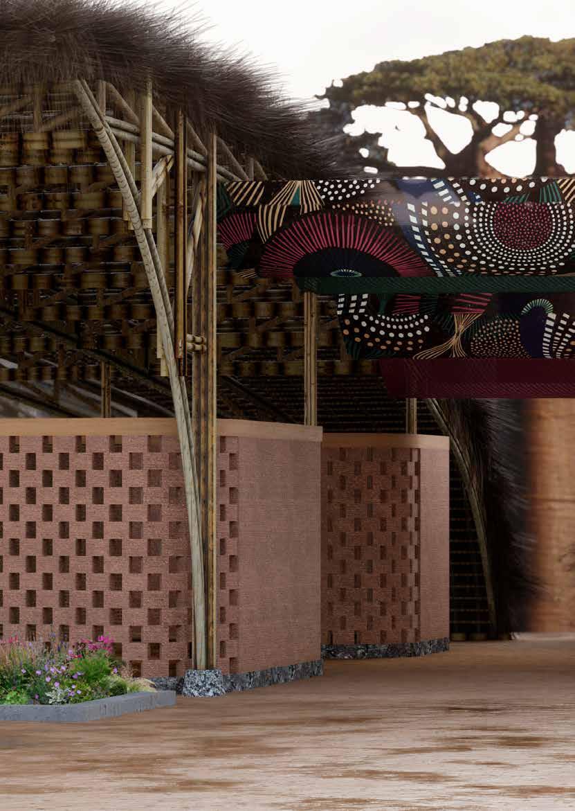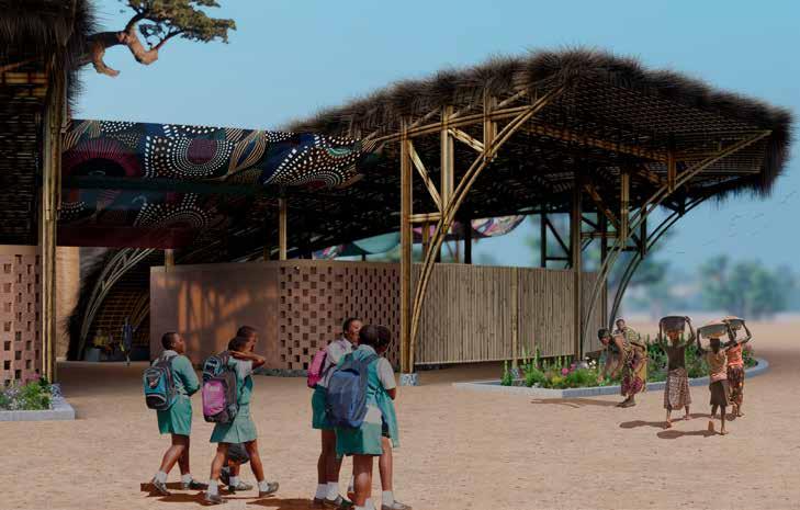 como as folhas de uma árvore Baobá. Por fim, o projeto abraça uma abordagem que combina elementos tradicionais e modulações fixas para facilitar a construção. A modulação foi desenvolvida com base na árvore Baobá, resultando em uma série de círculos concêntricos espaçados a cada 2 metros, com uma malha de eixos derivados da divisão angular do círculo em 16 partes iguais. E, entre os blocos, uma série de tecidos locais amarrados sombreiam parcialmente os espaços e adicionam cor e movimento ao projeto.
