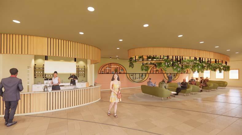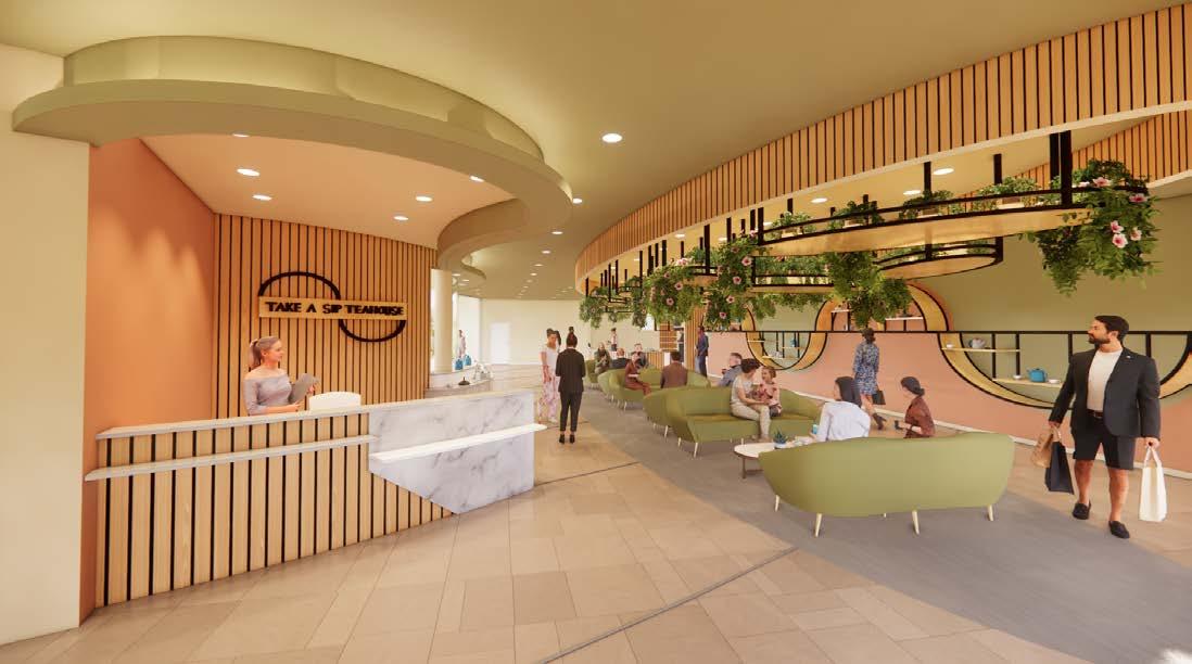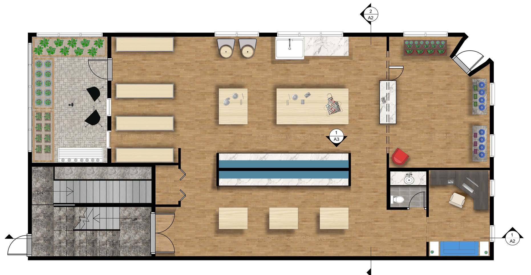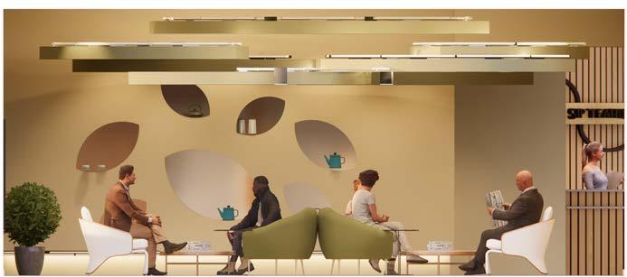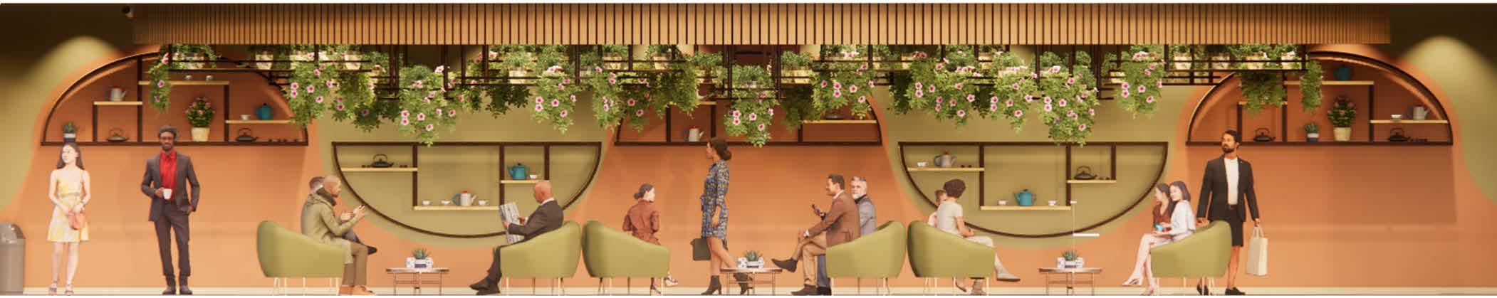 The lounge is a space designed to encourage conversation among guests. It provides a cozy seating area bounded by the ellipse shape carpet and ceiling features. In the center, display shelves are hung with potted plants to mimic the greenhouse experience. Lastly, on the back wall a series of display shelves can be found. They contain multiple levels to exhibit different featured teapots and teacups for sale.