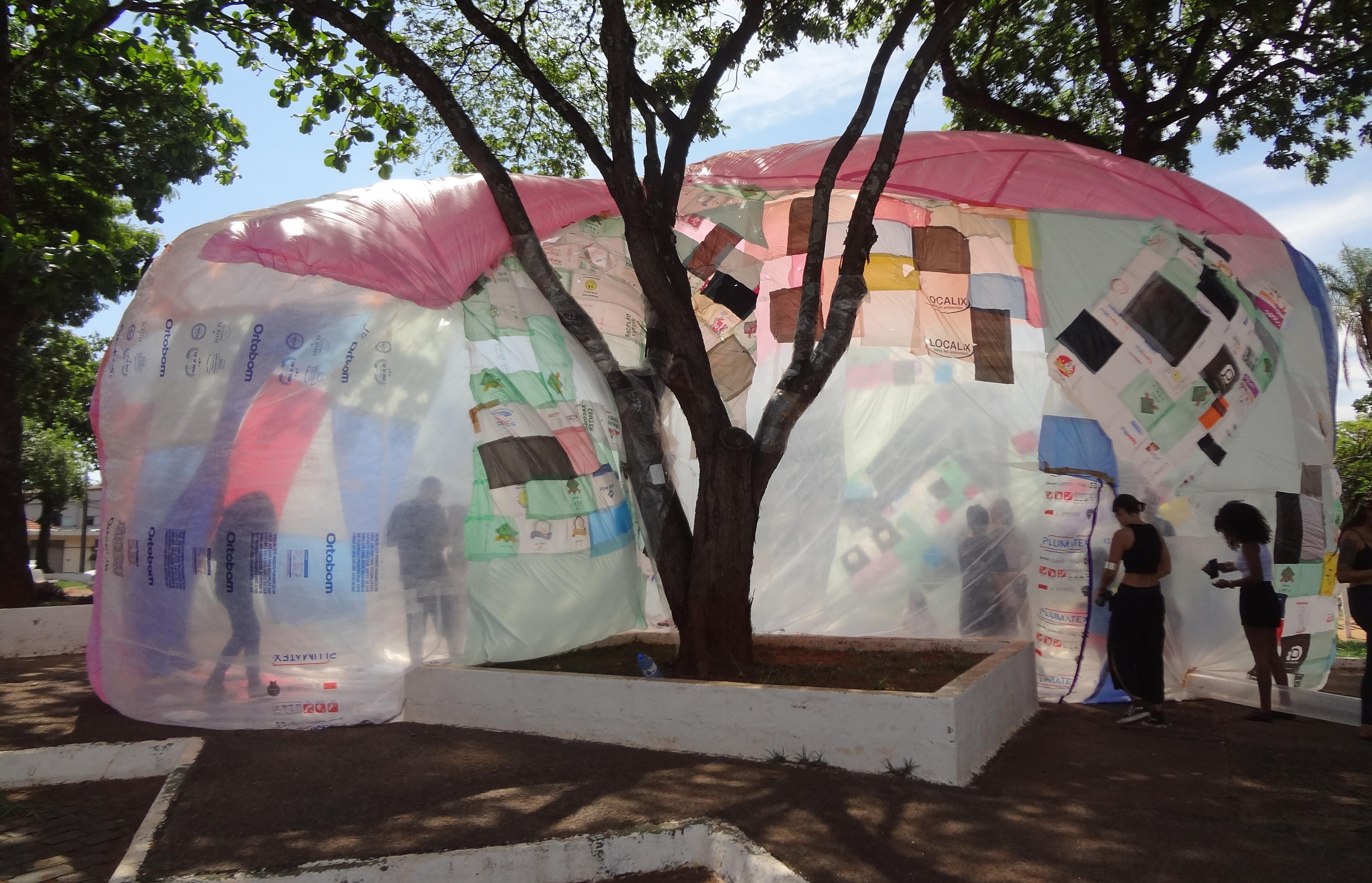 Broto: Uma sala de aula inflável entre as árvores de um espaço público. Instação urbana realizada junto ao coletivo Flutua como parte do projeto Flutua Educa.