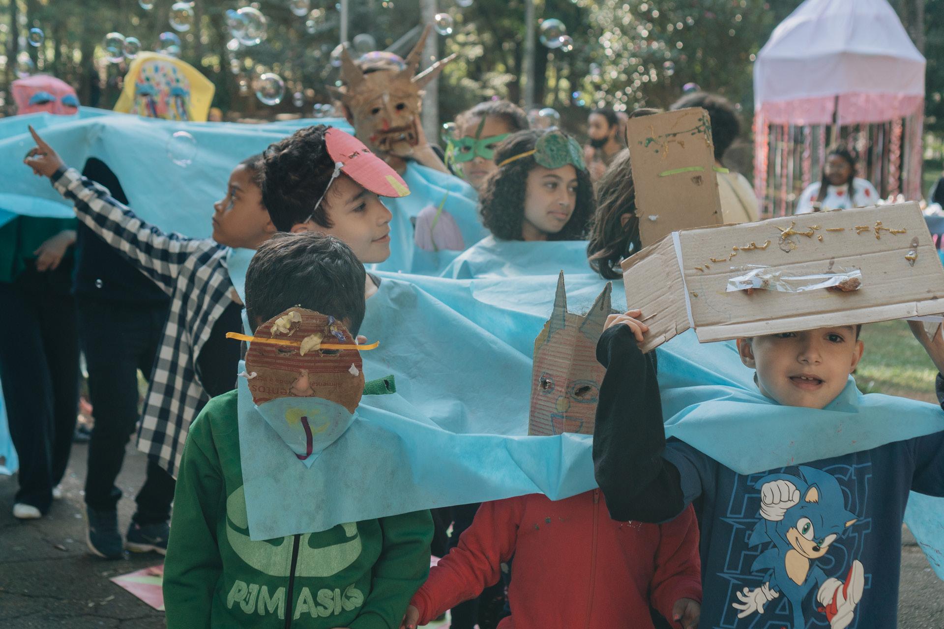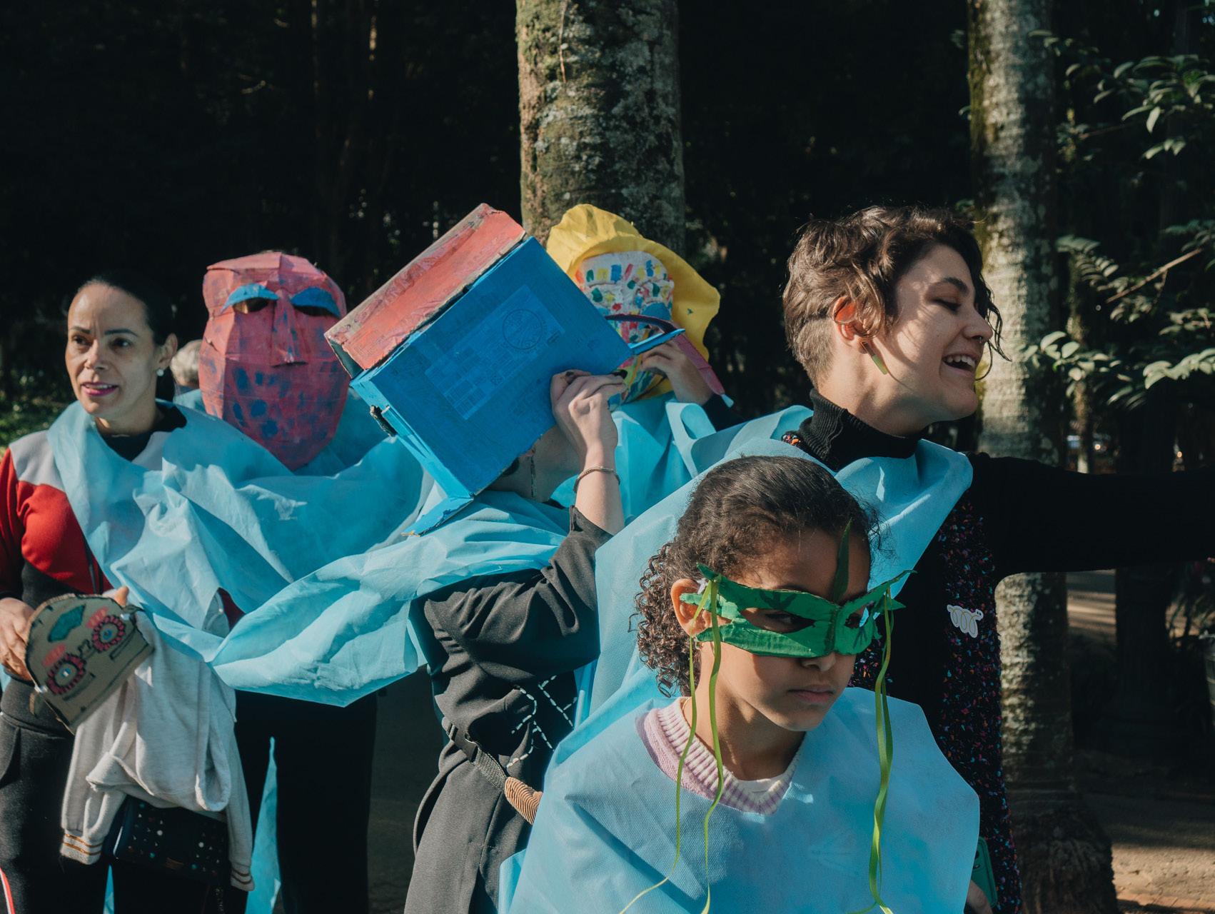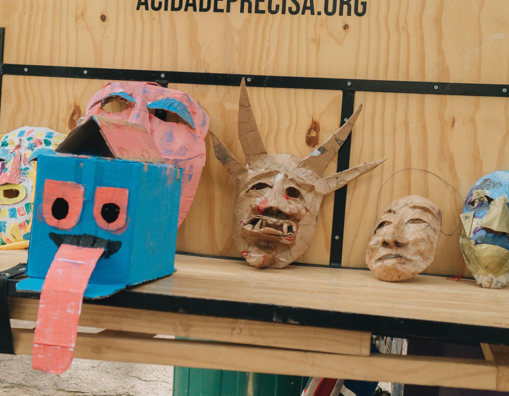 A partir de materiais coletados que seriam descartados como lixos instigamos as crianças presentes no Parque Buenos Aires a criarem máscaras-monstros.