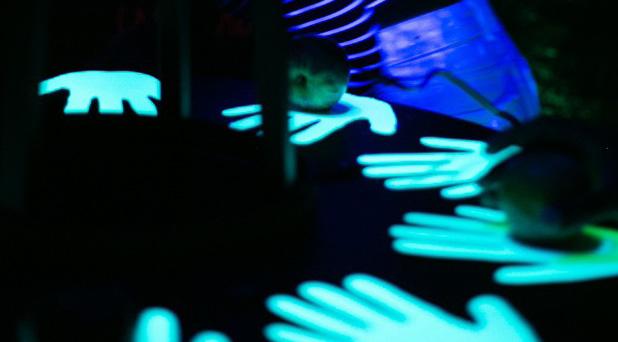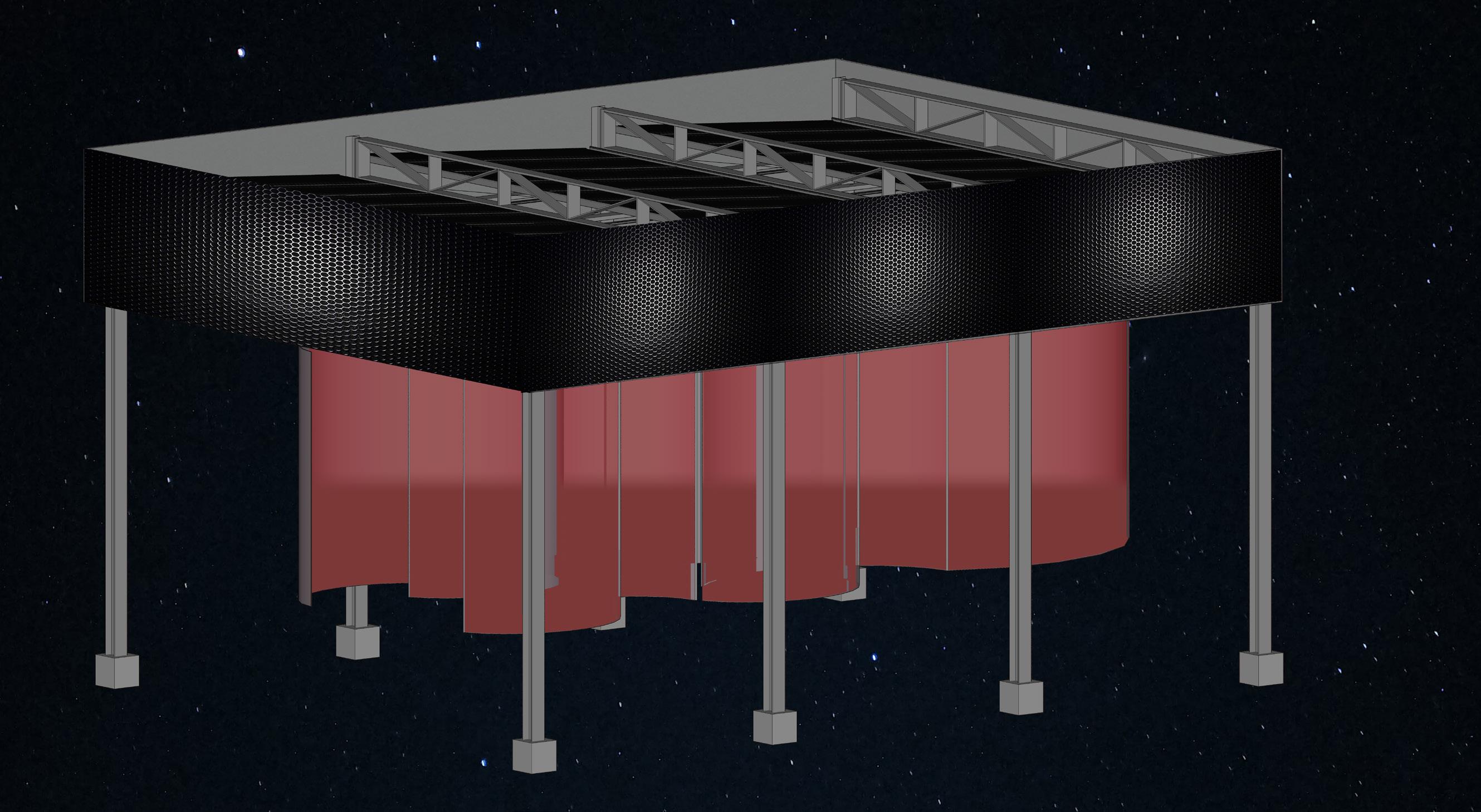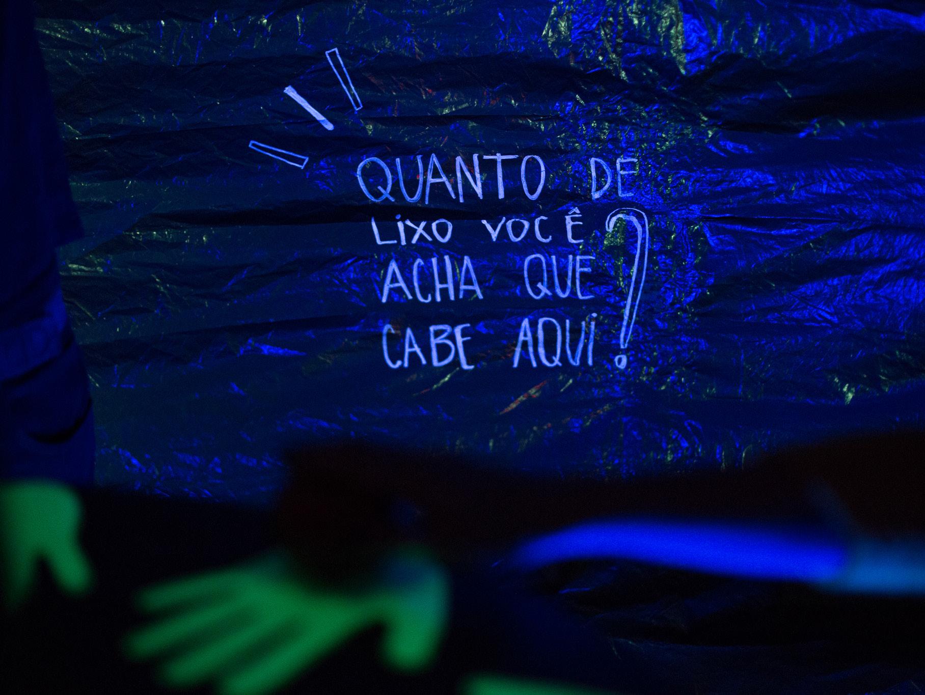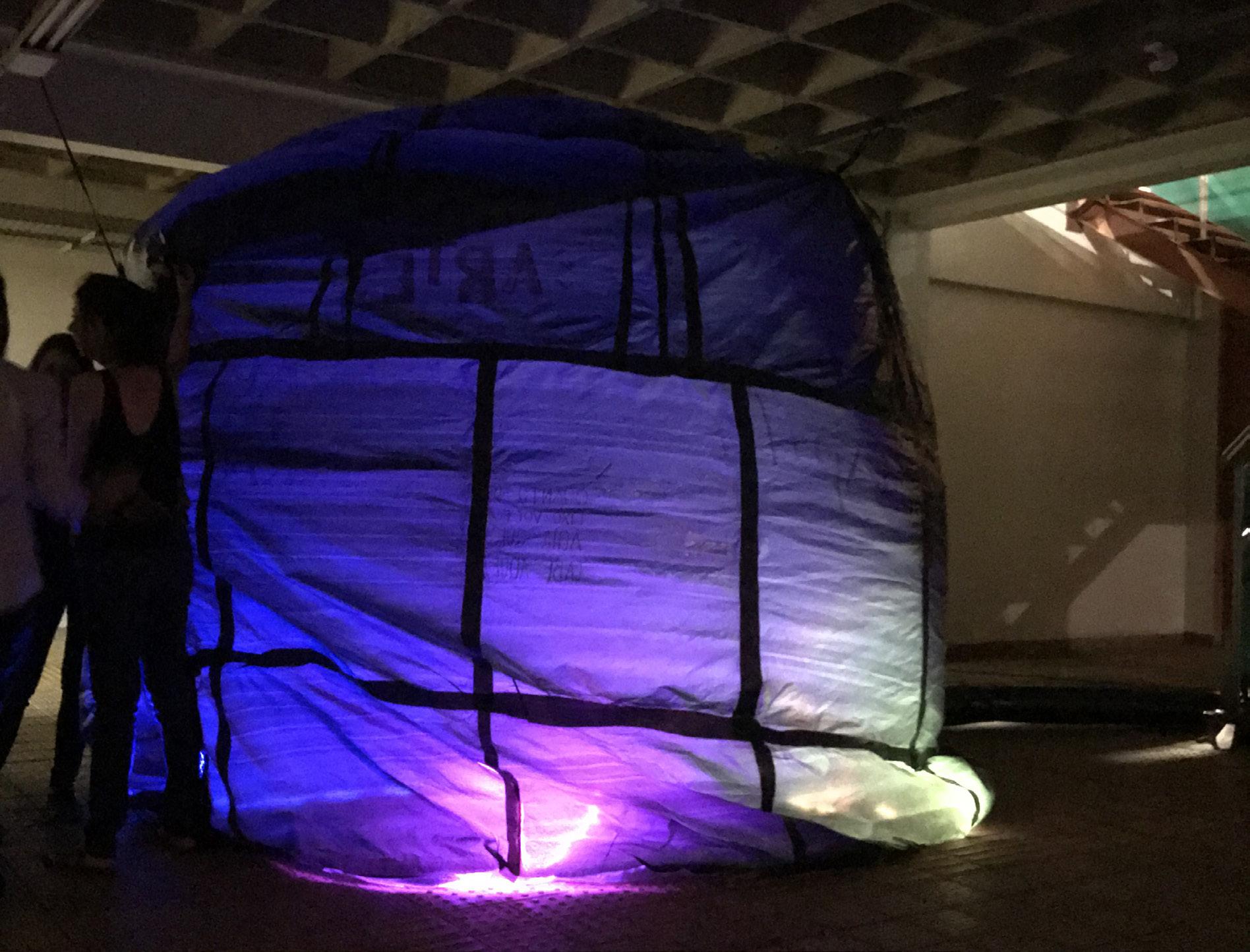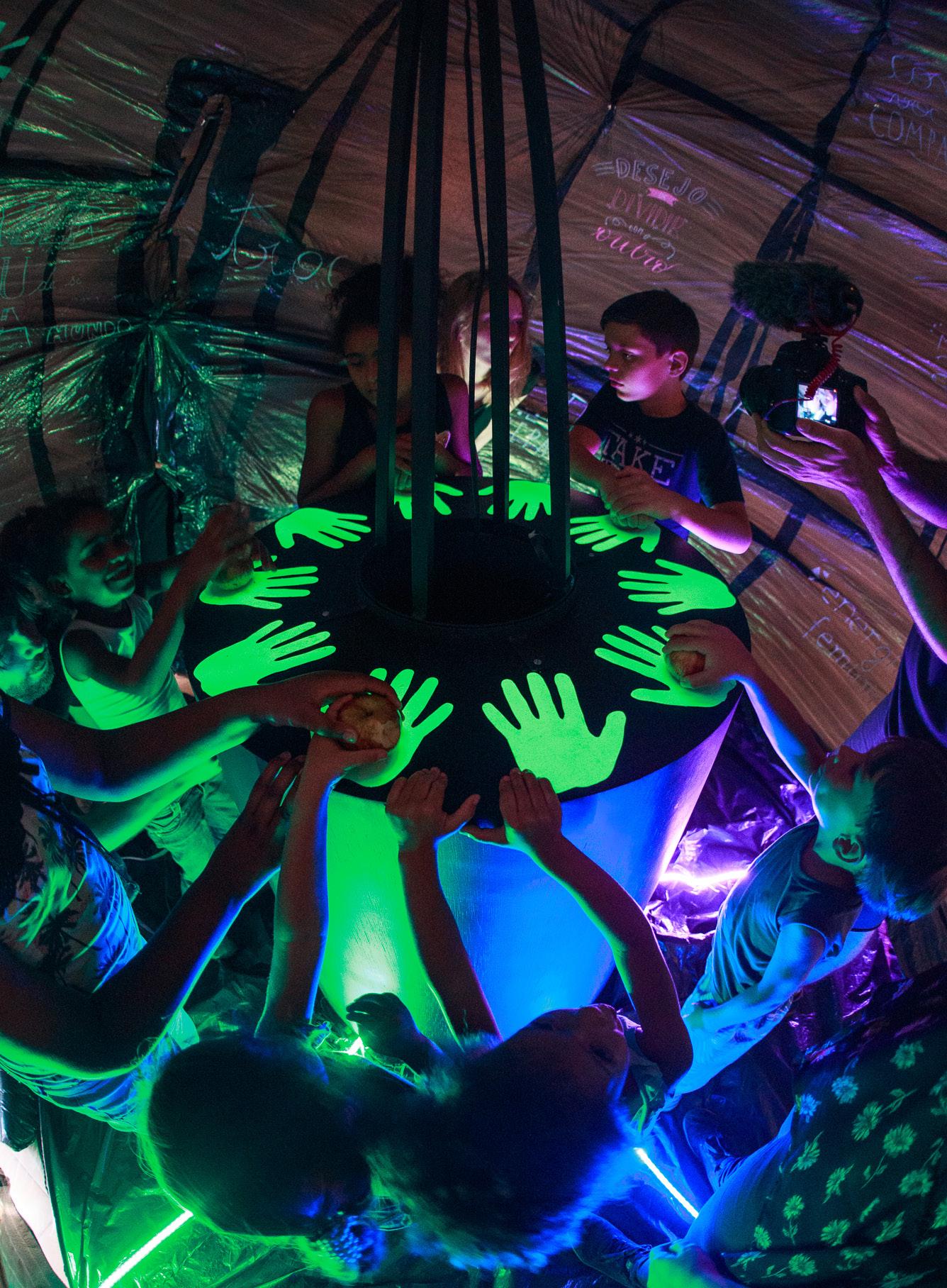 Estrutura e materialidades: Construído com sacos plásticos de lixo preto reciclados, e com formato cilíndrico-cupular, possui mãos luminosas dispostas sobre um totem central que esconde sensores conectados à 5 fitas de LED, quando acesos mostram os escritos em branco das paredes.