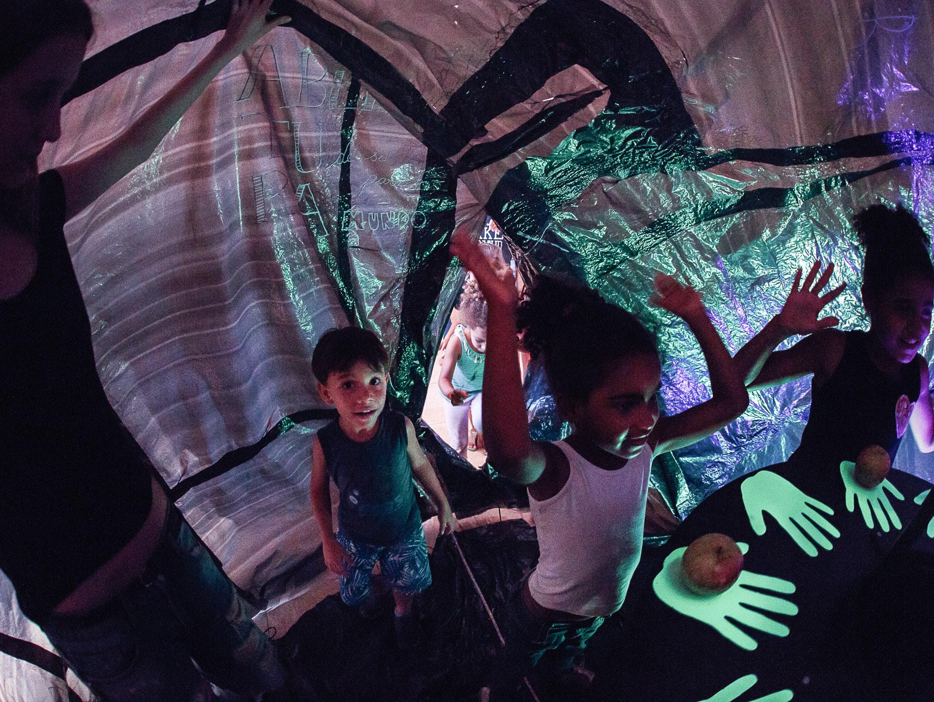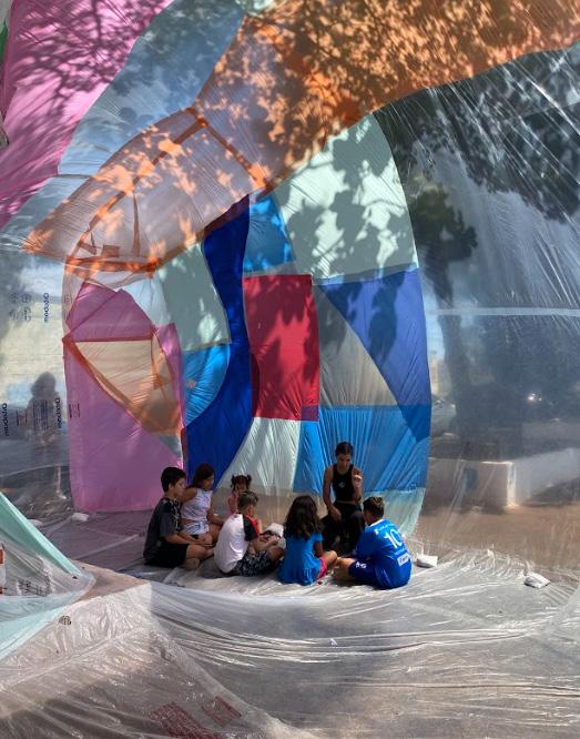 Broto: Uma sala de aula inflável entre as árvores de um espaço público. Instação urbana realizada junto ao coletivo Flutua como parte do projeto Flutua Educa.