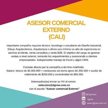 El principal objetivo es hacer crecer los clientes. Salario mínimo + todo lo de Ley + Comisiones Horario: de L a V de 8 a 5 y Sab de 8 a 1 Contrato fijo Interesados enviar HV al correo: recursoshumanosyofertas@outlook.com Debe indicar el nombre del cargo
