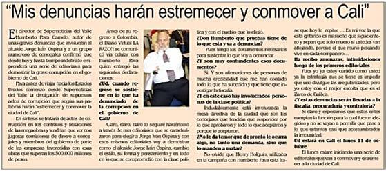 El alcalde de Cali, Jor ge Iván Ospina, perdió el control de su administra ción. Cada minuto apare cen nuevos escándalos y la desconfianza ciudada na aumenta. El viernes último la revista Semana denunció supuestas irre gularidades en un con trato de catastro con pre suntos sobrecostos por quince mil millones de pesos. Cita como fuente a